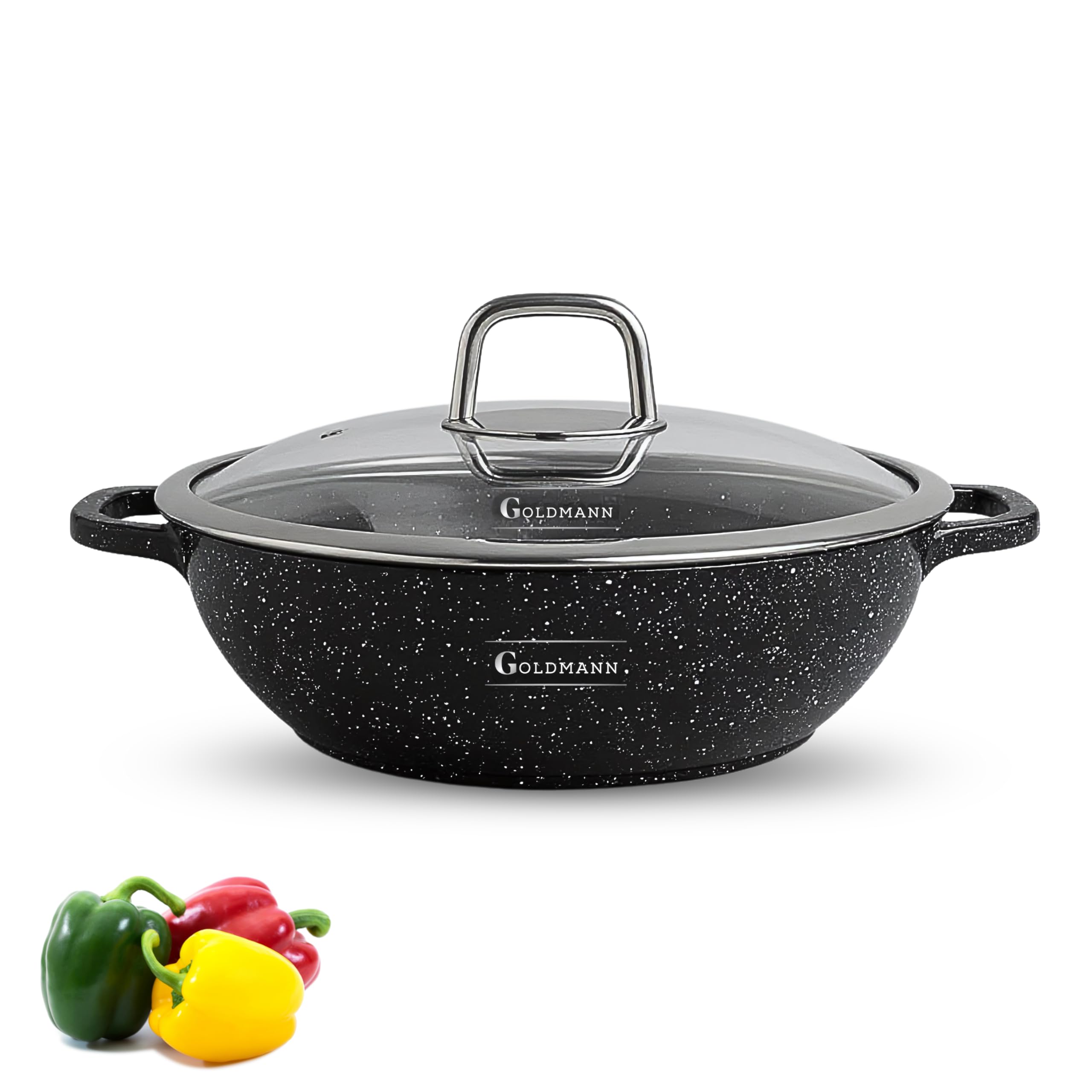 Wow, diese Servierpfanne von GOLDMANN ist einfach praktisch! Aus robustem Aluguss mit super Keramik-Marmor-Beschichtung - da brennt nichts an und du brauchst kaum Fett. Der Glasdeckel mit Dampfventil ist genial, damit gelingt alles perfekt. Mit 28cm Durchmesser und 4,1 Liter Fassungsvermögen ideal für die ganze Familie. Egal ob Eintöpfe, Currys oder Soßen - du kochst darin und servierst direkt am Tisch. Funktioniert auf allen Herdarten, auch Induktion! Und das Beste: Sie ist spülmaschinengeeignet und völlig PFOA-frei. Die ergonomischen Griffe liegen super in der Hand. Perfekt für alle, die gerne kochen und praktische Küchenhelfer lieben. Ein echter Allrounder für deine Küche - damit wird Kochen zum Vergnügen!
