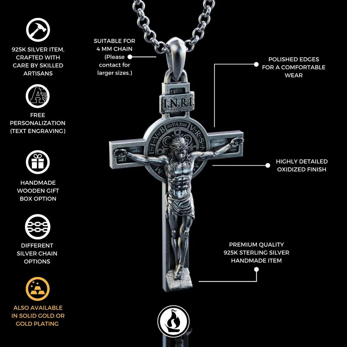Dieses wunderschöne St. Benedikt Kruzifix ist mehr als nur Schmuck - es ist ein richtiges Schutzsymbol! Hergestellt in Italien von erfahrenen Handwerkern, mit 7,6cm Höhe und in Druckguss-Qualität. Das Besondere: Kreuz und Korpus sind aus einem Stück - nichts kann sich lösen oder verloren gehen. Der heilige Benedikt ist bekannt als Schutzpatron der Schüler und Studenten - aber auch als Helfer gegen negative Einflüsse. Perfekt als Geschenk zur Erstkommunion, Konfirmation, Hochzeit oder einfach so für liebe Menschen. Mit dabei ist eine Informationskarte die alles erklärt. Sieht nicht nur gut aus, sondern hat auch eine tiefe Bedeutung. Ein Stück das jahrelang begleitet und geschätzt wird. Ob als Anhänger an der Kette oder als kleines Kreuz für zu Hause - einfach ein schönes und sinnvolles Geschenk!