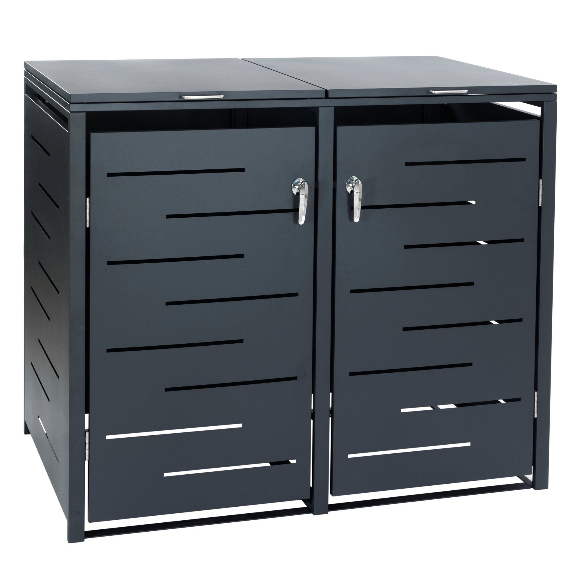 Schluss mit unordentlichen Mülltonnen! Diese HEIGART Mülltonnenbox in Anthrazit versteckt zwei Tonnen bis 240L und sieht dabei noch richtig gut aus. Aus verzinktem, pulverbeschichtetem Stahl ist sie absolut wetterfest und rostfrei. Das Schrägdach lässt Regenwasser ablaufen, und der Kettenzug ermöglicht das gleichzeitige Öffnen von Box und Tonnendeckel. Die Gasdruckfedern mit Soft-Close-Funktion sorgen für sanftes Schließen ohne Knallen. Magnetverschlüsse an den Fronttüren machen die Handhabung super einfach. Deine Mülltonnen sind vor neugierigen Blicken und Wetter geschützt, und dein Vorgarten sieht gleich viel aufgeräumter aus. Einfach aufstellen und sich über mehr Ordnung freuen!