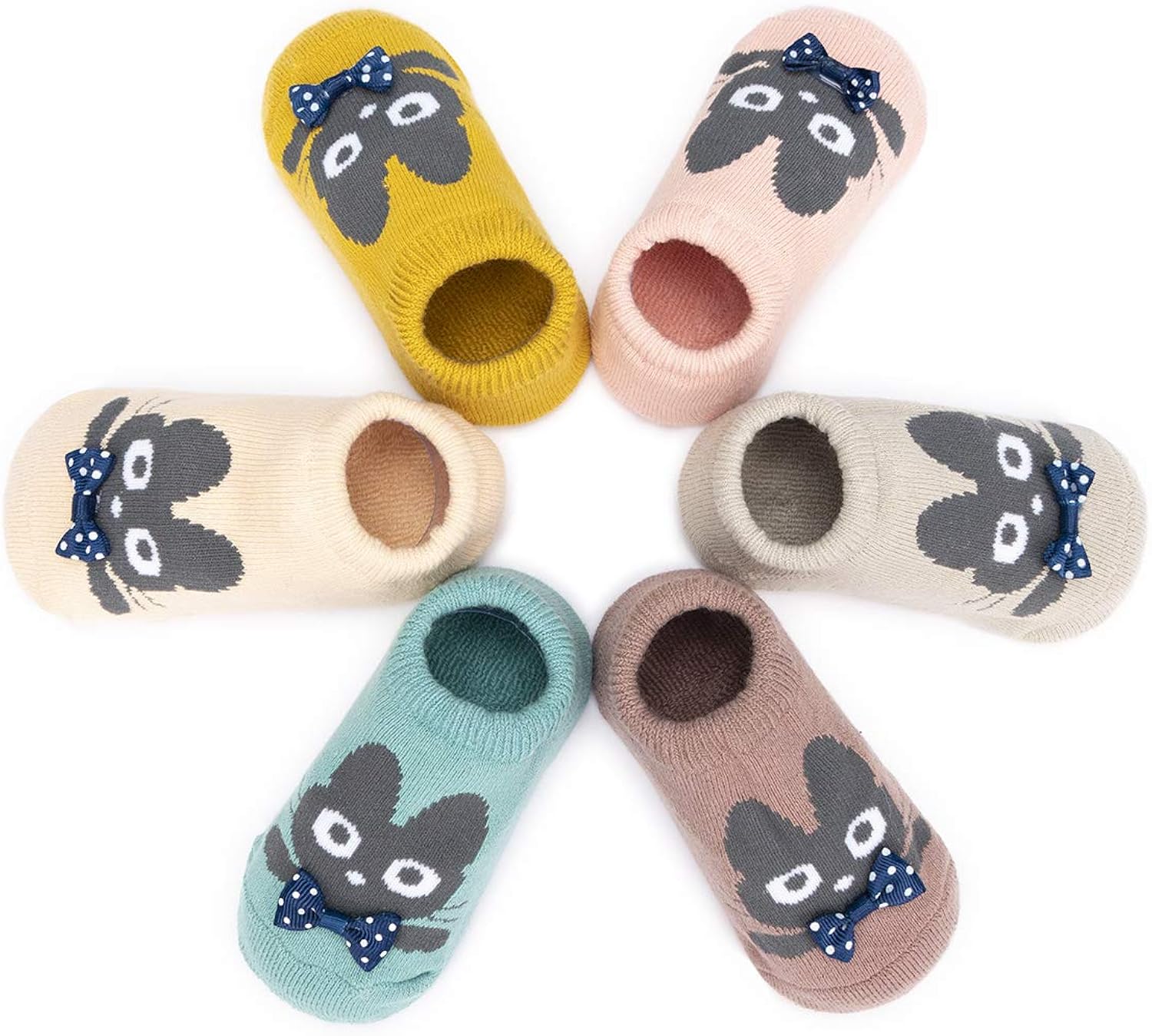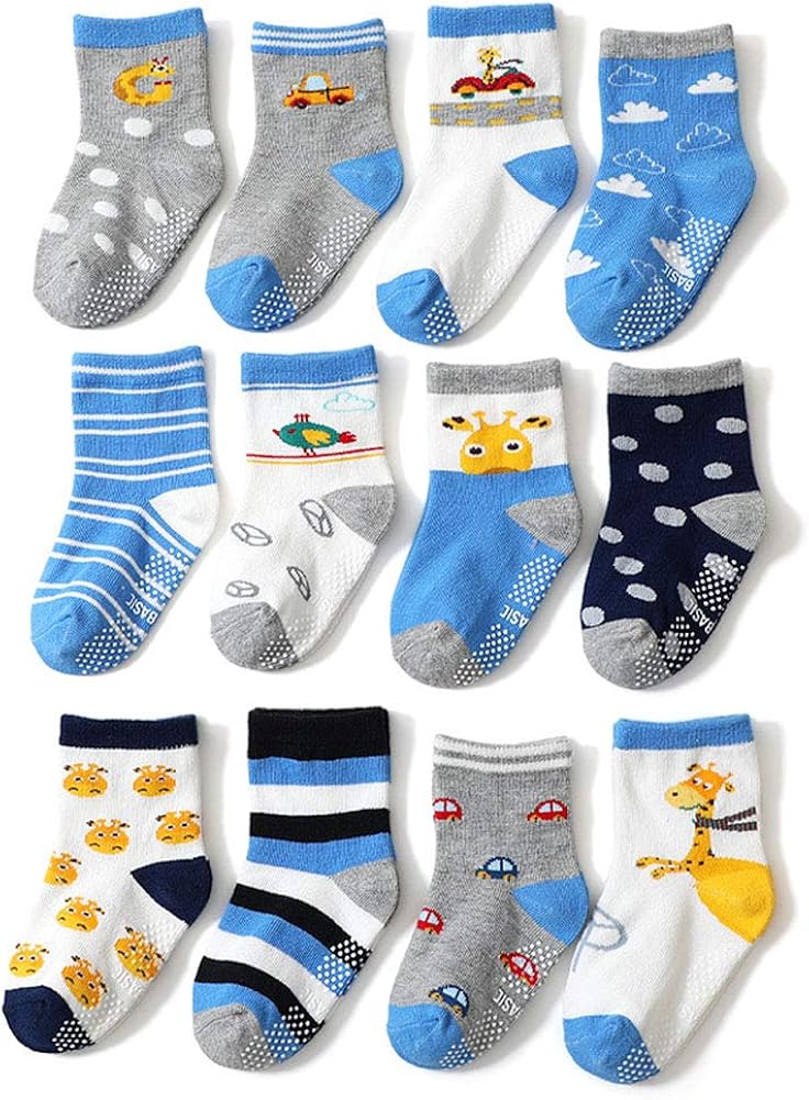 Diese süßen Anti-Rutsch Socken sind perfekt für krabbelnde und laufende Babys! 4 Paar im Set, aus weicher Baumwolle (78,4%) mit Nylon und Elasthan für perfekten Sitz. Die gummierten Griffe an der Sohle geben sicheren Halt auf glatten Böden - ob beim Laufen lernen, Krabbeln oder Spielen. Knochenlose Nähte an den Zehen für maximalen Komfort, doppelt verstärkte Ferse damit nichts verrutscht. Elastische Bündchen die nicht einschneiden. In verschiedenen Größen von 0-8 Jahren erhältlich. Die niedlichen Cartoon-Motive machen jede Socke zum Highlight. Perfekt für zu Hause, Kindergarten oder unterwegs. Einfach in der Maschine waschbar und farbecht. Super als Geschenk zur Taufe, Geburtstag oder Weihnachten. Dein Baby bewegt sich sicher und hat dabei stylische Füßchen - was will man mehr?