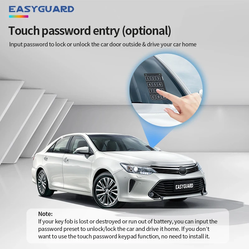 Modernisiere dein Auto mit diesem smarten Alarmsystem! Der EASYGUARD Alarm lässt sich bequem per Smartphone-App steuern (iOS & Android). Features: Fernstart, Push-Start-Taste, Näherungsentriegelung, Keyless Entry, Stoßalarm und Panikmodus. Für 95% aller 12V Fahrzeuge geeignet - Automatik und Schaltgetriebe, Benzin und Diesel. Wichtig: Nicht für Fahrzeuge mit serienmäßigem Startknopf. Installation sollte von Fachpersonal durchgeführt werden. Für Fernstart ggf. zusätzliches Bypass-Modul nötig. Mach dein Auto sicherer und komfortabler - steuere alles bequem von deinem Handy aus!