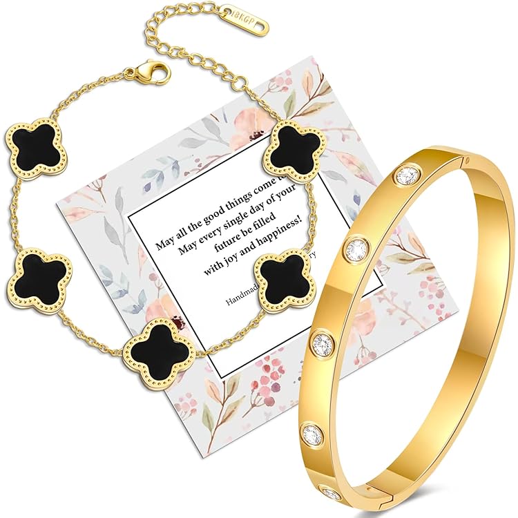 Dieses wunderschöne Armband-Set bringt Glück und Style an dein Handgelenk! Die zwei Armbänder - eines mit Glückskleeblatt, eines mit funkelnden Zirkonia-Steinen - sind aus rostfreiem Titanstahl mit 18K Vergoldung. Die verstellbare Länge von 17+5cm passt an jedes Handgelenk. Perfekt zum Stapeln oder einzeln tragen, zu jedem Outfit. Das Kleeblatt symbolisiert Glück, die Zirkonia Steine strahlen pure Eleganz aus. In Weiß, Gold oder Schwarz erhältlich - da ist für jeden Geschmack was dabei. Ein traumhaftes Geschenk für besondere Anlässe oder einfach um sich selbst zu verwöhnen!