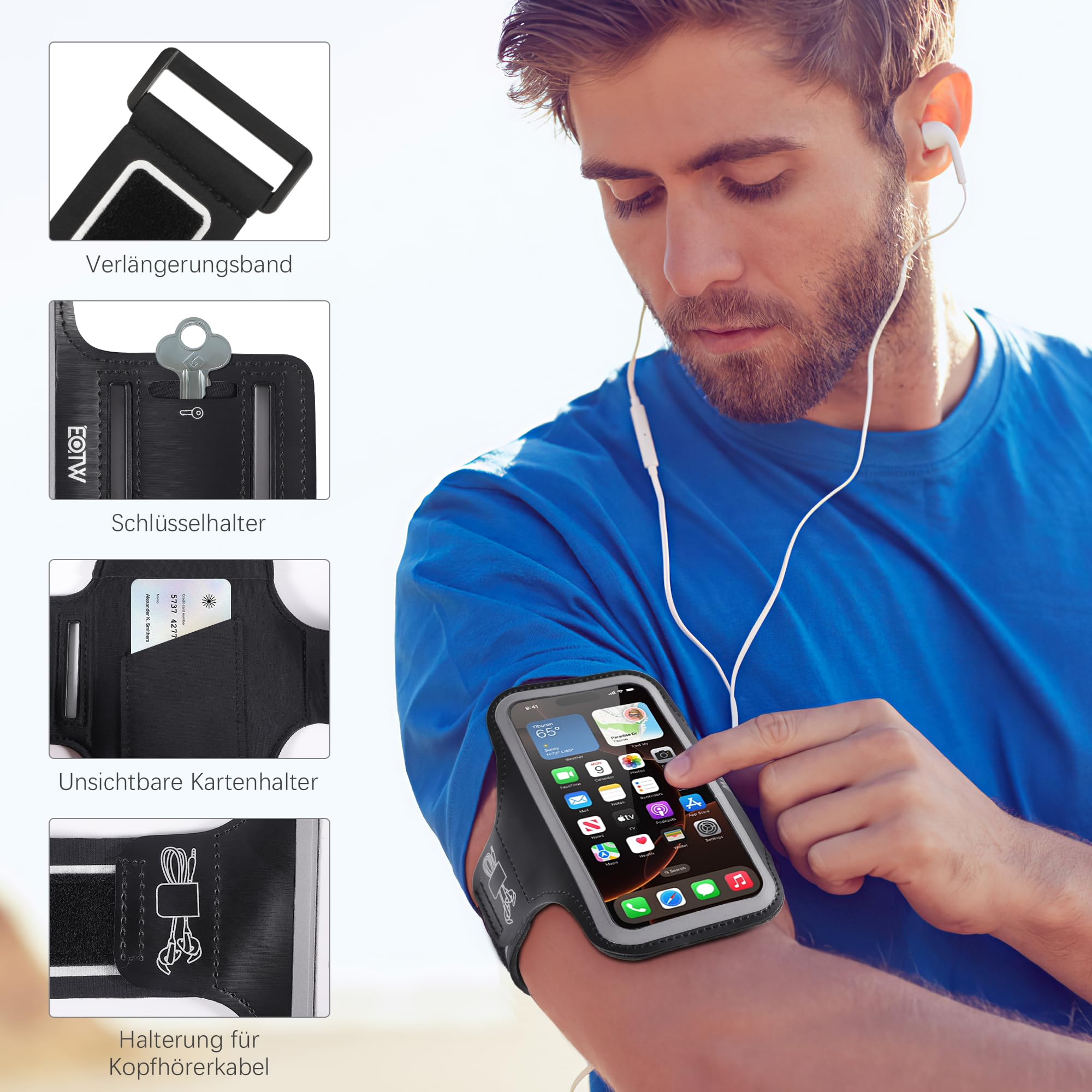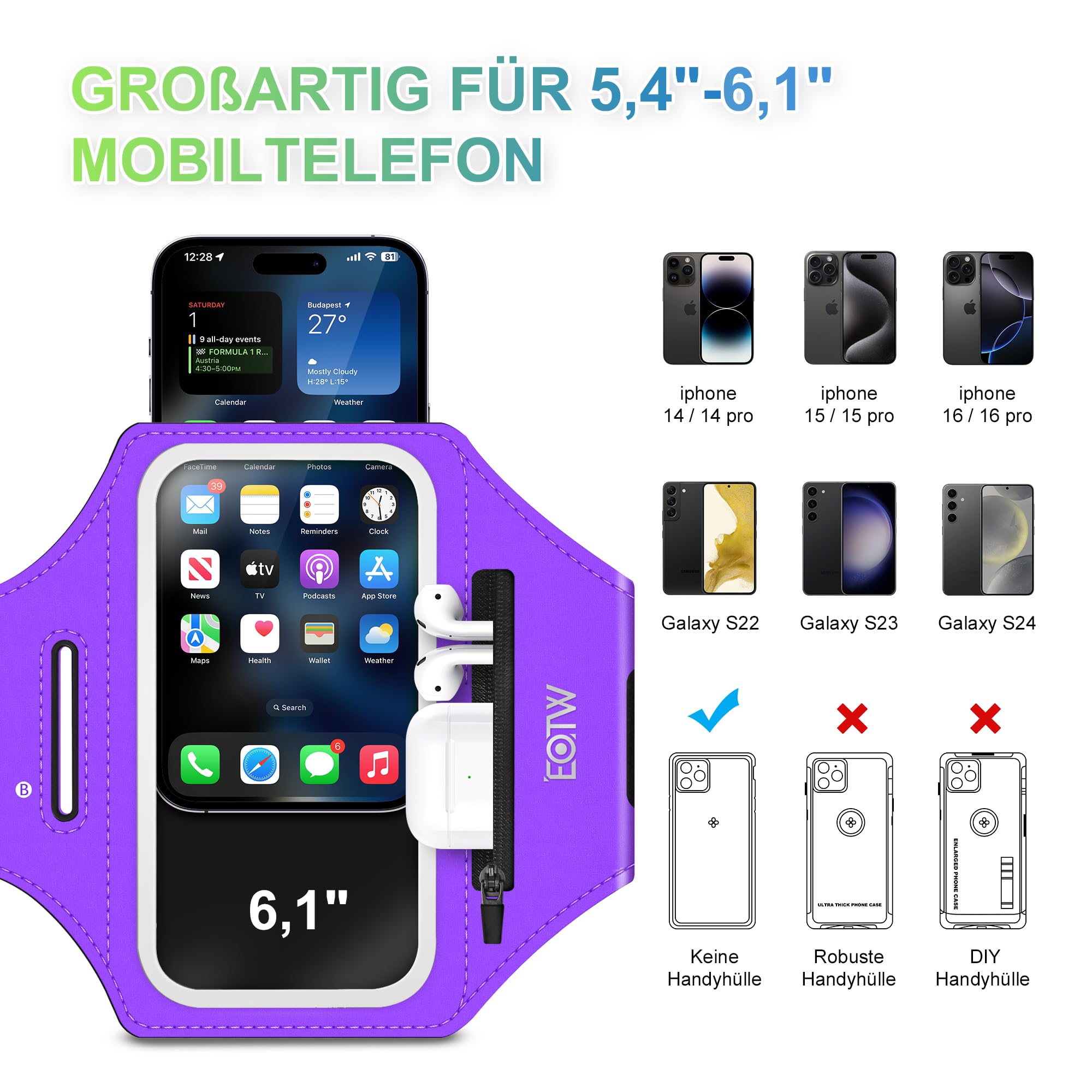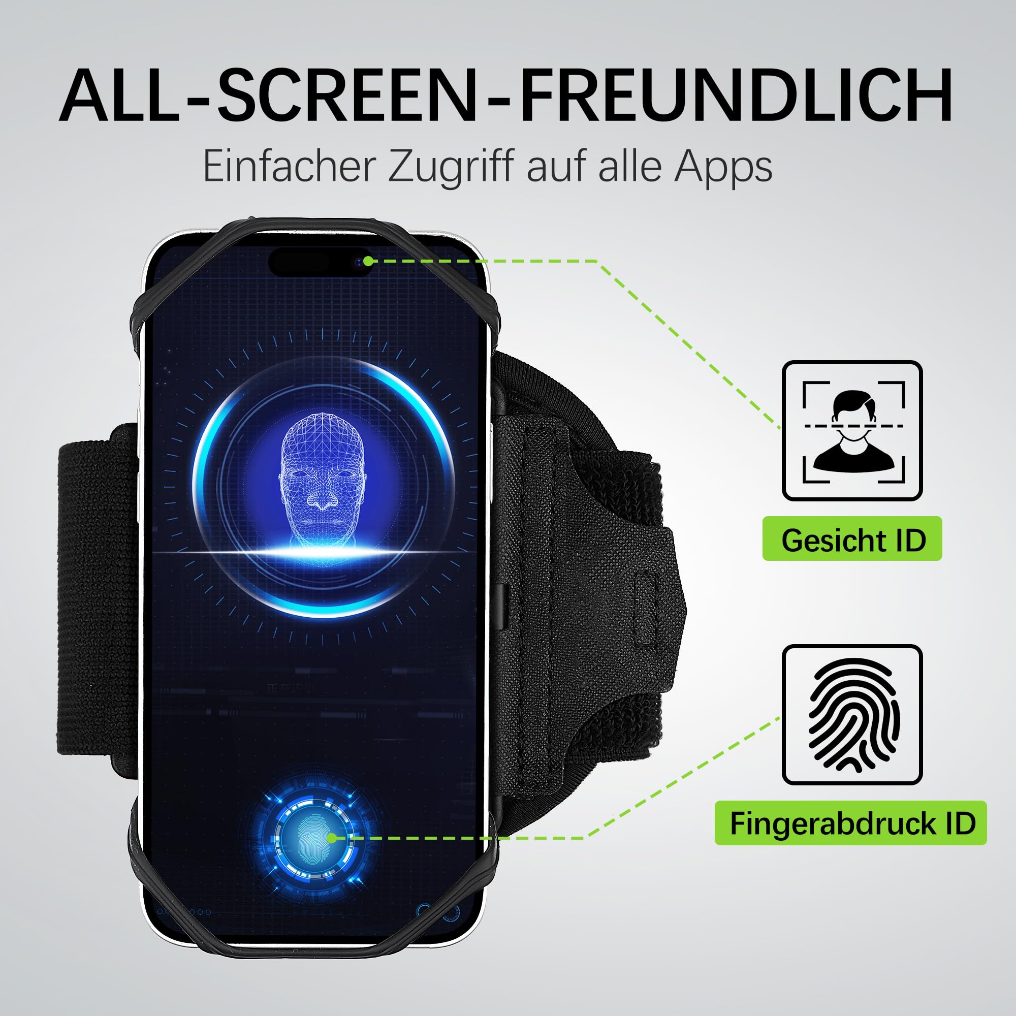 Diese Armtasche ist mein neuer Lauf-Begleiter! Passt für 5,8-6,5 Zoll Handys: iPhone 16-13, Galaxy S24-S22. Verstellbar von 26-59cm Armumfang - passt jedem. Touchscreen funktioniert durchs Fenster - muss nicht rausnehmen. Reflektierende Streifen - sicher bei Dunkelheit. Anti-Sturz Schnalle - fällt nicht runter. Mit Kartenfach und Kopfhörer-Auslass - alles dabei. Perfekt für Laufen, Radfahren, Fitness. Leicht und bequem - merkt man kaum!