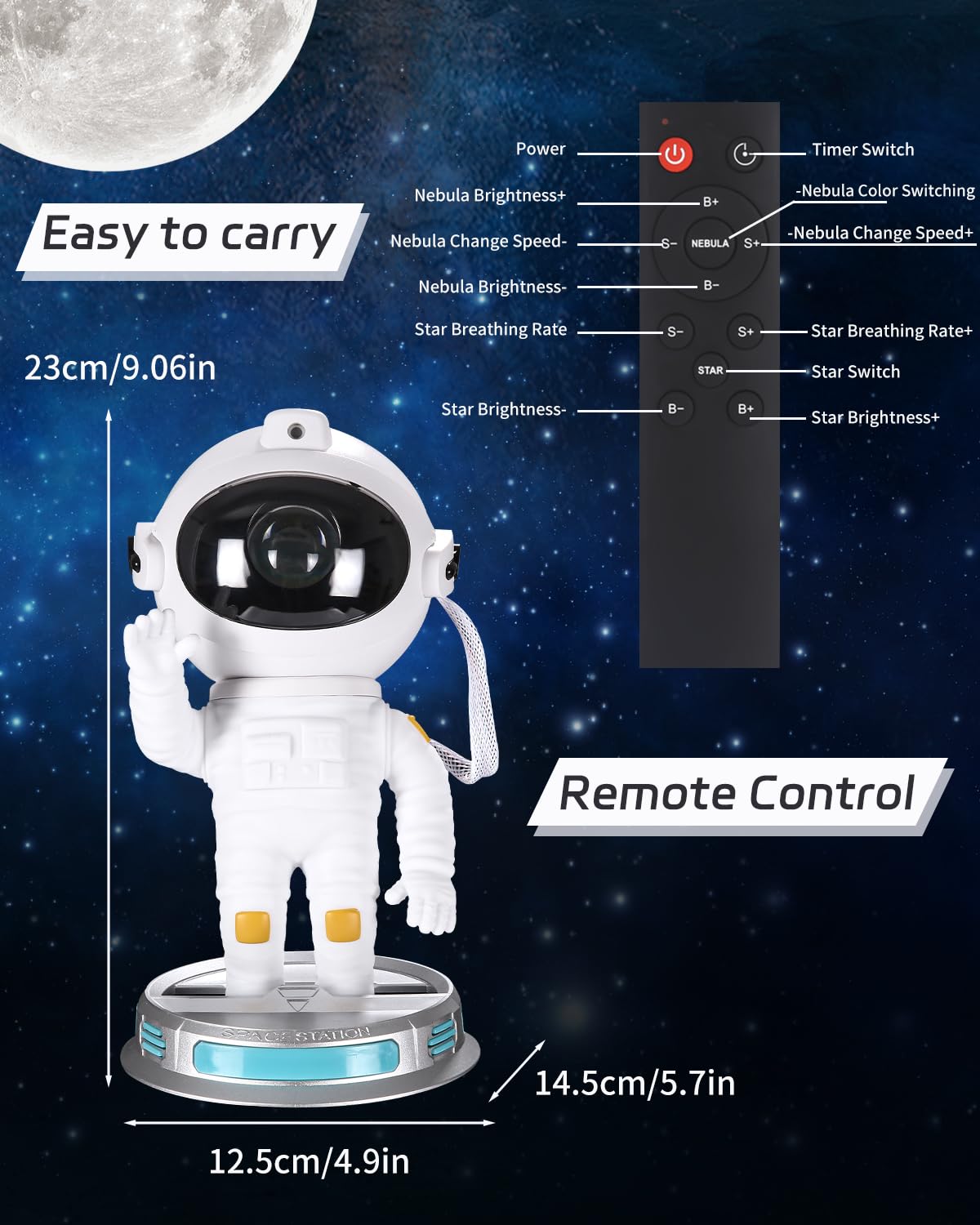 Verwandle dein Zimmer in eine magische Galaxie! Dieser coole Astronaut-Projektor bringt den Sternenhimmel direkt zu dir nach Hause. Mit 21 verschiedenen Lichteffekten und funkelnden Sternen kreierst du eine traumhafte Atmosphäre. Per Fernbedienung oder Touch-Tasten steuerst du Farben, Helligkeit und Blinkmodi. Der magnetische Kopf lässt sich beliebig drehen für perfekte Projektion. Timer-Funktion schaltet sich automatisch ab - ideal zum Einschlafen. Ob Kinderzimmer, Schlafzimmer oder Party - dieses Licht schafft sofort Stimmung. Der abnehmbare Mond und bewegliche Arme machen den Astronauten zum echten Hingucker. Ein fantastisches Geschenk für Groß und Klein. Träume unter dem eigenen Sternenhimmel!