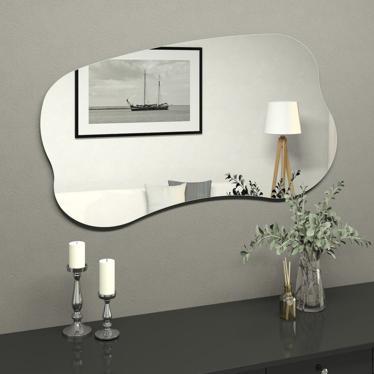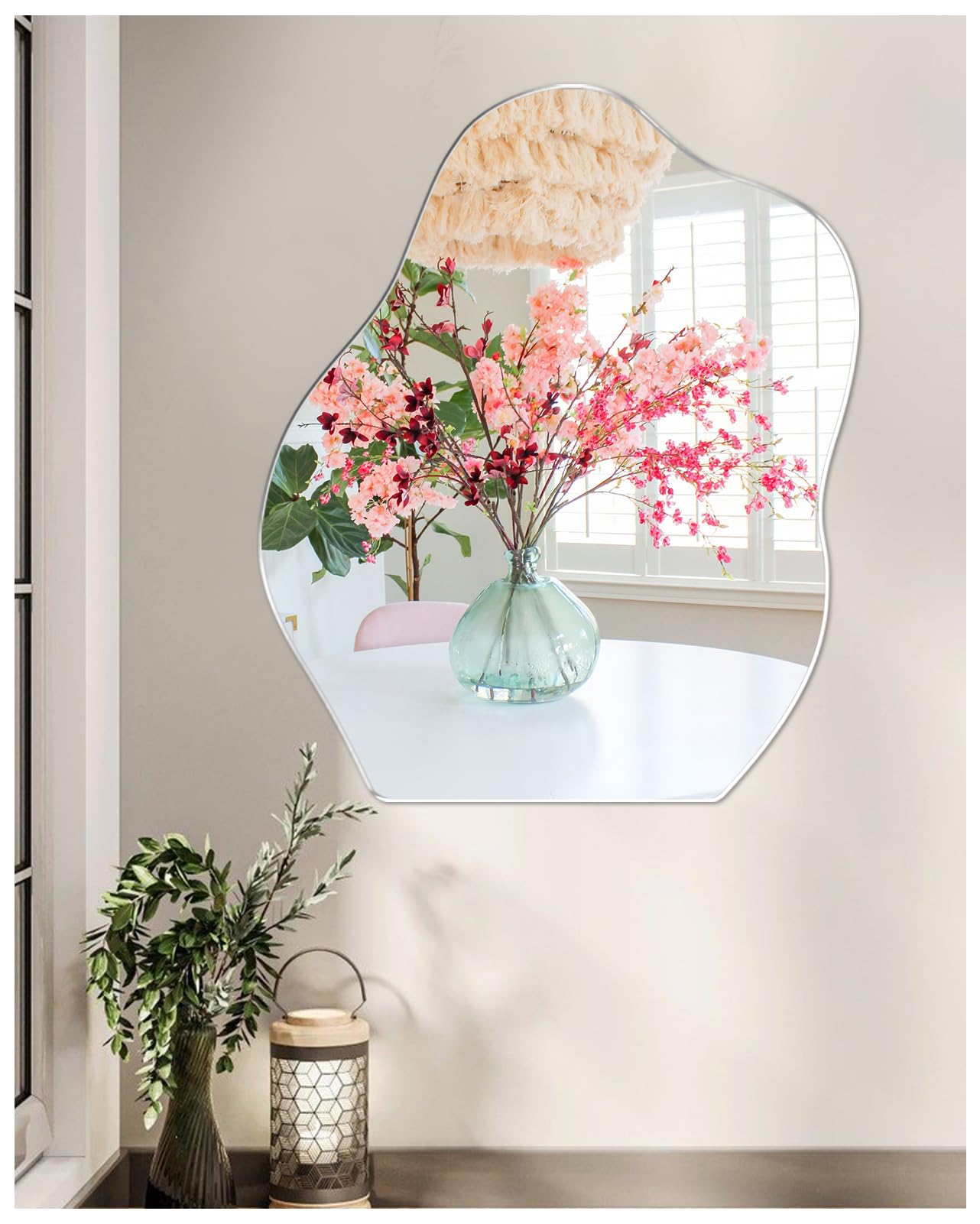 Wow, dieser Spiegel ist echt was Besonderes! Die asymmetrische Form bringt sofort einen modernen Touch in jeden Raum. Aus hochwertigem 3mm Glas - super klare Reflexion. Und das beste: Kein Bohren nötig! Einfach mit den beiliegenden Klebepads an der Wand befestigen. Oder du stellst ihn einfach auf den Schreibtisch oder Schminktisch - total flexibel! Ob horizontal oder vertikal - du bestimmst die Ausrichtung. Perfekt für Wohnzimmer, Bad, Flur oder Schlafzimmer. Schafft sofort ein helleres, größeres Raumgefühl. Und als Deko-Element ist er einfach unschlagbar! Macht sich auch super als Geschenk für Einrichtungsfans. Einfach kreativ werden und deinen eigenen Look kreieren - der Spiegel passt sich dir an, nicht umgekehrt! Ein echter Hingucker der garantiert Gesprächsthema wird.