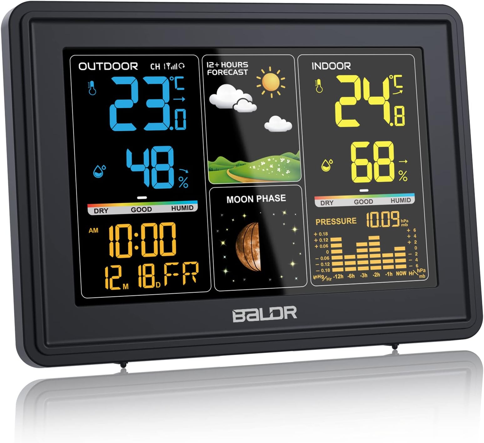 Willst du immer wissen, wie's draußen wird? Die CSL Wetterstation mit ihrem klaren Farbdisplay zeigt dir alle wichtigen Wetterdaten auf einen Blick!\\n\\nDas kann sie:\\n- Misst Temperatur und Luftfeuchtigkeit innen & außen\\n- Atomuhr mit DCF-Signal für sekundengenaue Zeit\\n- Wettervorhersage mit Trendanzeige\\n- Frostalarm warnt vor kalten Temperaturen\\n- Mondphasen-Anzeige für Romantiker\\n\\nDer Außensensor hat ne Reichweite bis 100m (frei) und ist spritzwassergeschützt (IPX4). Perfekt für Balkon, Terrasse oder Garten. Das Display ist optimal lesbar von schräg oben - ideal für Couchtisch oder Nachttisch.\\n\\nLieferung inklusive Netzteil und Außensensor. Batterien für den Sensor brauchst du extra. Mit 14,8x8,5x4,5cm ist die Station kompakt aber gut ablesbar. Endlich immer den perfekten Zeitpunkt für Gartenarbeit oder Spaziergänge erwischen!