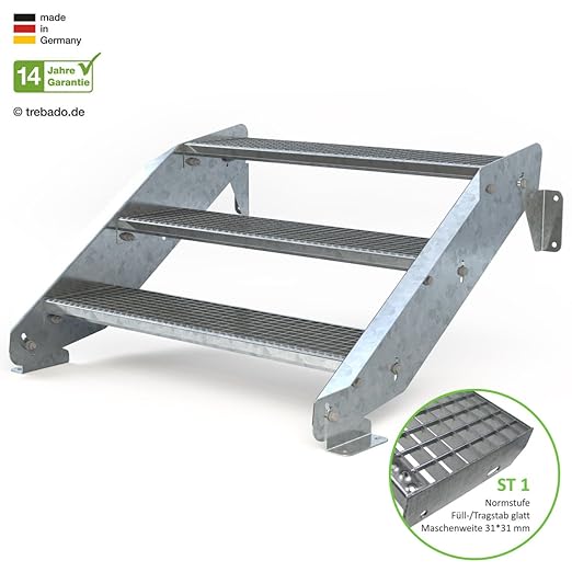 Perfekte Lösung für deine Terrasse oder den Hauseingang! Diese robuste Außentreppe aus feuerverzinktem Stahl hat 4 Stufen mit rutschfestem Gitterrost und einer praktischen Podeststufe. Das Beste: Die Höhe ist von 66 bis 80 cm einstellbar - passt sich also perfekt deiner Bausituation an. Mit 100 cm Stufenbreite und 27 cm Stufentiefe bietet sie sicheren Tritt. Das Geländer (98 cm hoch) kann links oder rechts montiert werden. Made in Germany mit 14 Jahren Garantie! Als montagefertiger Bausatz mit Anleitung - zu zweit an einem Tag aufgebaut. Witterungsbeständig und rostfrei - hält ewig im Außenbereich!