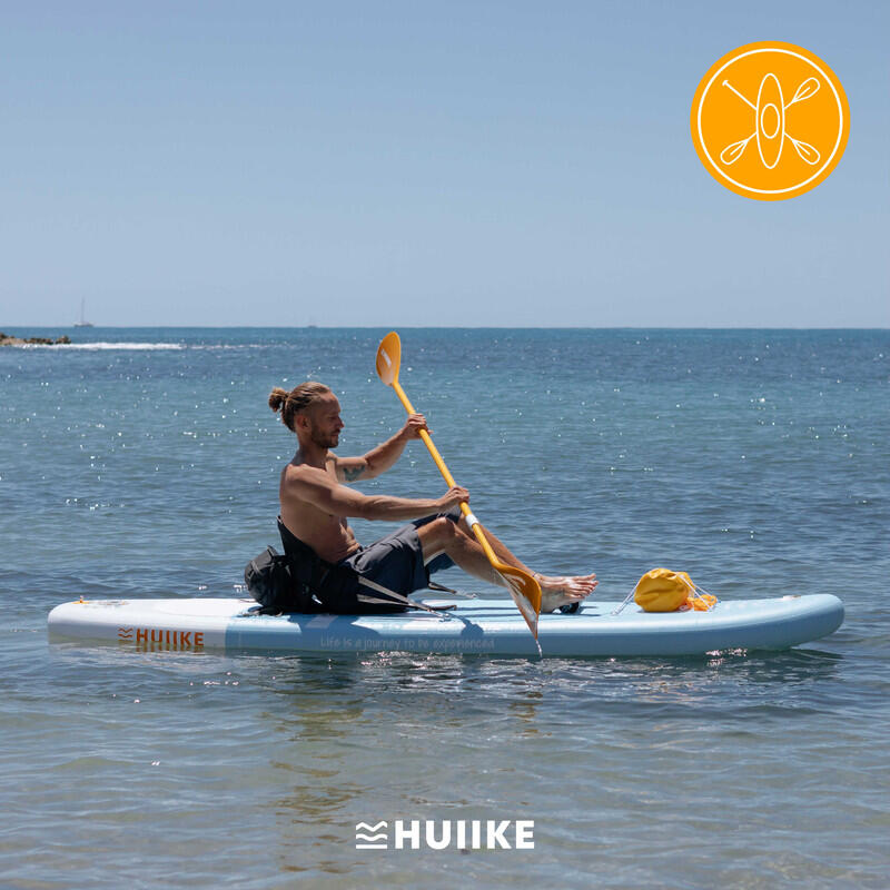 Im Lieferumfang ist alles dabei: Gepolsterter Rucksack, Druckluftpumpe, 3-teiliges verstellbares Paddel (165-205cm), Flossen, Sicherheitsleine und Reparatur-Set. In nur 10 Minuten aufgebaut - und schon geht's auf's Wasser!