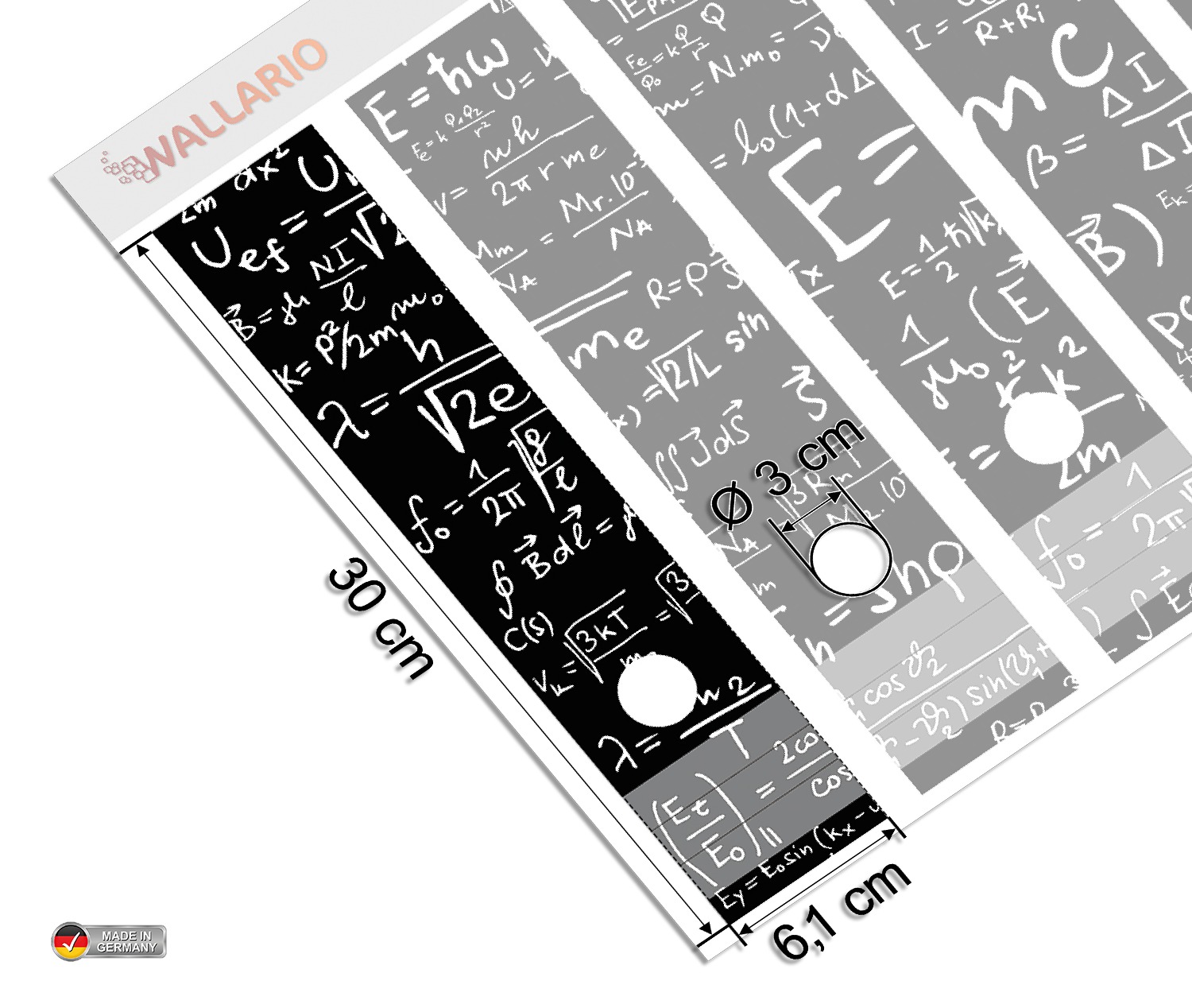 Mach deine Ordner zu echten Hinguckern! Diese Wallario Aufkleber mit mathematischen Formeln und Relativitätstheorie sehen einfach genial aus. Im Set sind 6 Stück für breite Ordner (7-8 cm) enthalten. Maße: 6,3cm breit, 30cm hoch - perfekt für Standard-Ordner! Selbstklebend und bereits vorgeschnitten, inklusive Beschriftungsfeld für deine Notizen. Einfach abziehen, aufkleben und schon sieht dein Ordnerregal wie eine kleine Wissenschafts-Bibliothek aus! Hergestellt in Deutschland in bester Qualität. Perfekt für Lehrer, Studenten, Physiker oder alle, die Mathe lieben!