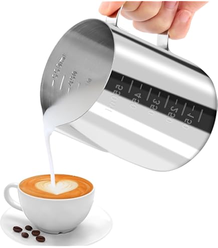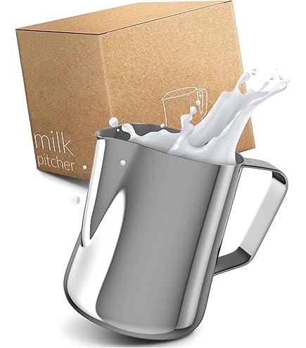 Kreiere perfekten Milchschaum wie ein Barista! Dieses hochwertige Milchkännchen aus Deutschland macht es möglich. Mit 350ml Fassungsvermögen ist es ideal für 2 Cappuccino oder einen großen Café Latte. Die spezielle Antihaftbeschichtung innen und außen verhindert das Anbrennen der Milch und macht die Reinigung zum Kinderspiel.\\n\\nDer tropffreie Ausguss ist perfekt für kunstvolle Latte Art - verziere deine Kaffee-Kreationen wie ein Profi! Die Maße von 8x10cm liegen gut in der Hand und mit nur 216g ist das Kännchen angenehm leicht. Aus rostfreiem Edelstahl und spülmaschinengeeignet für praktischen Alltagsgebrauch.\\n\\nTipp: Die Milch sollte beim Aufschäumen idealerweise etwa 65°C erreichen - so brennt sie nicht an und entwickelt den besten Schaum. Das Kännchen selbst nicht erhitzen! Ein Muss für alle Kaffee-Liebhaber, die zu Hause professionellen Milchschaum genießen möchten.
