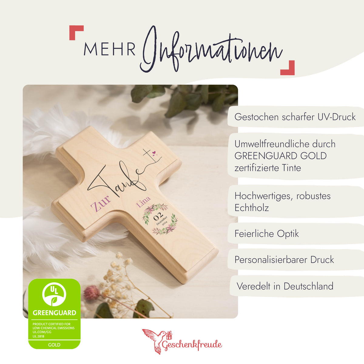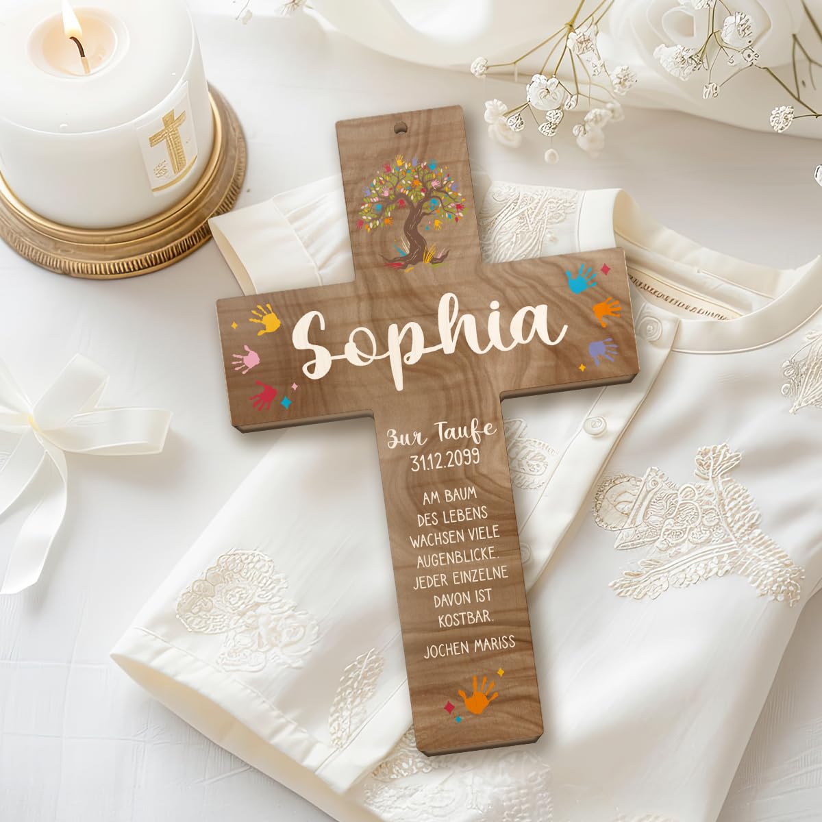 Ein einzigartiges Taufgeschenk mit persönlicher Note! Dieses wunderschöne Taufkreuz aus Birkensperrholz (10mm stark) mit Walnuss-Optik und Lebensbaum-Motiv kann komplett personalisiert werden. Maße 13x20cm, mit hochwertigem UV-Druck der nicht verblasst. Schadstofffrei und kindgerecht. Einfach online gestalten - wir setzen es in Handarbeit in Nürnberg um. Ein bleibendes Erinnerungsstück zur Taufe, das viele Jahre Freude bereitet. Made in Germany mit Liebe zum Detail.