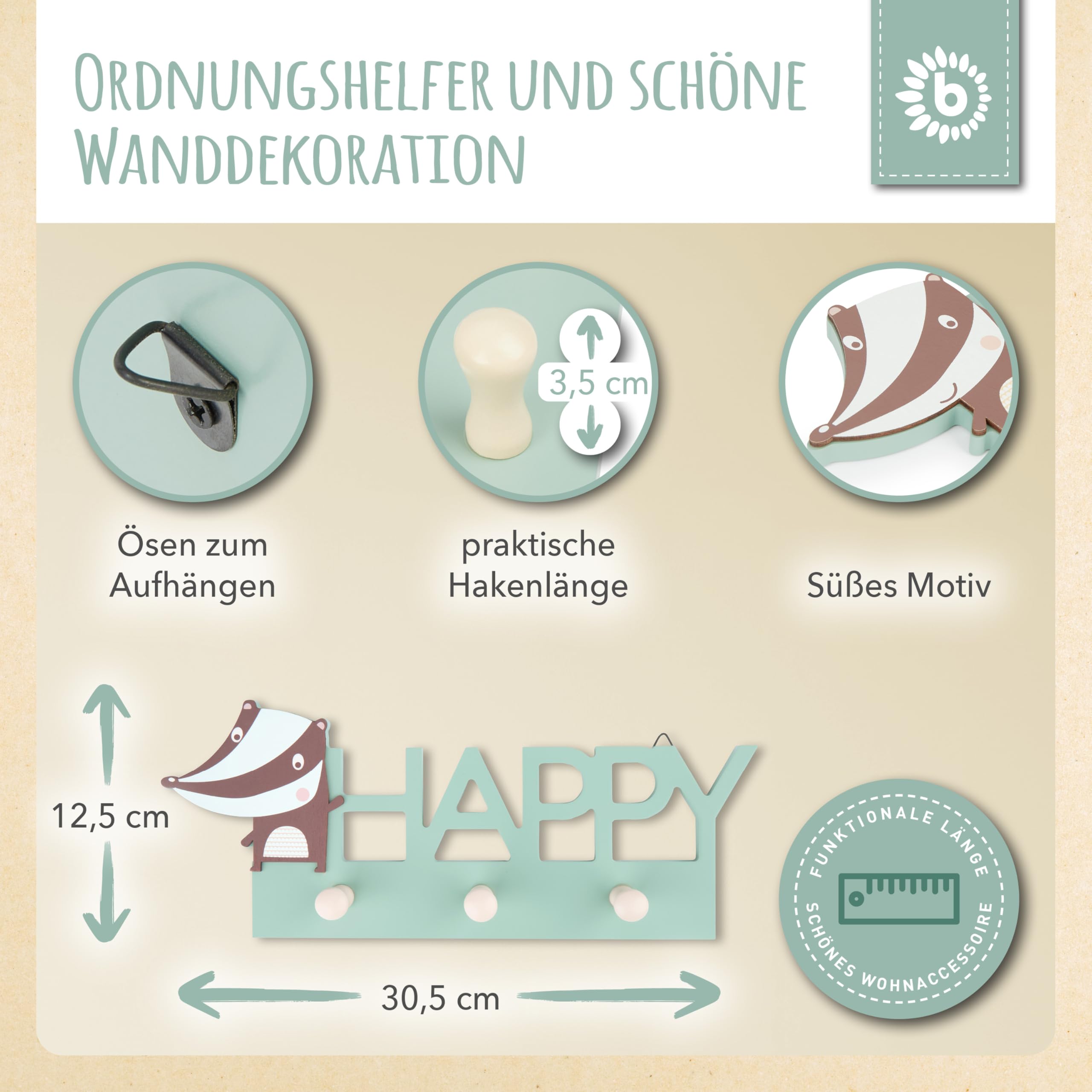 Dieser niedliche Marienkäfer-Haken bringt Kinderaugen zum Strahlen! Das liebevoll gestaltete Wandaccessoire aus hochwertigem Holz (12,5x15,5cm) mit einer süßen Blume ist perfekt fürs Kinderzimmer, aber auch als Deko für andere Räume geeignet. Der praktische Haken (4cm lang mit 1,3cm Knauf) hält sicher Jacken, Taschen oder Handtücher. Echte Handarbeit aus Europa - die hochwertige Verarbeitung sieht man jedem Detail an. Im Lieferumfang sind bereits Dübel und Schrauben enthalten, sodass du den Haken sofort montieren kannst. Passt super zu den anderen Motiven der Serie wie Wanduhren, Fensterbildern und Stifteboxen. Ein charmantes Accessoire, das nicht nur praktisch ist, sondern auch noch richtig gut aussieht. Perfekt um kleine Jacken, Rucksäcke oder auch bunte Schals ordentlich aufzuhängen - und das alles mit einem Lächeln!