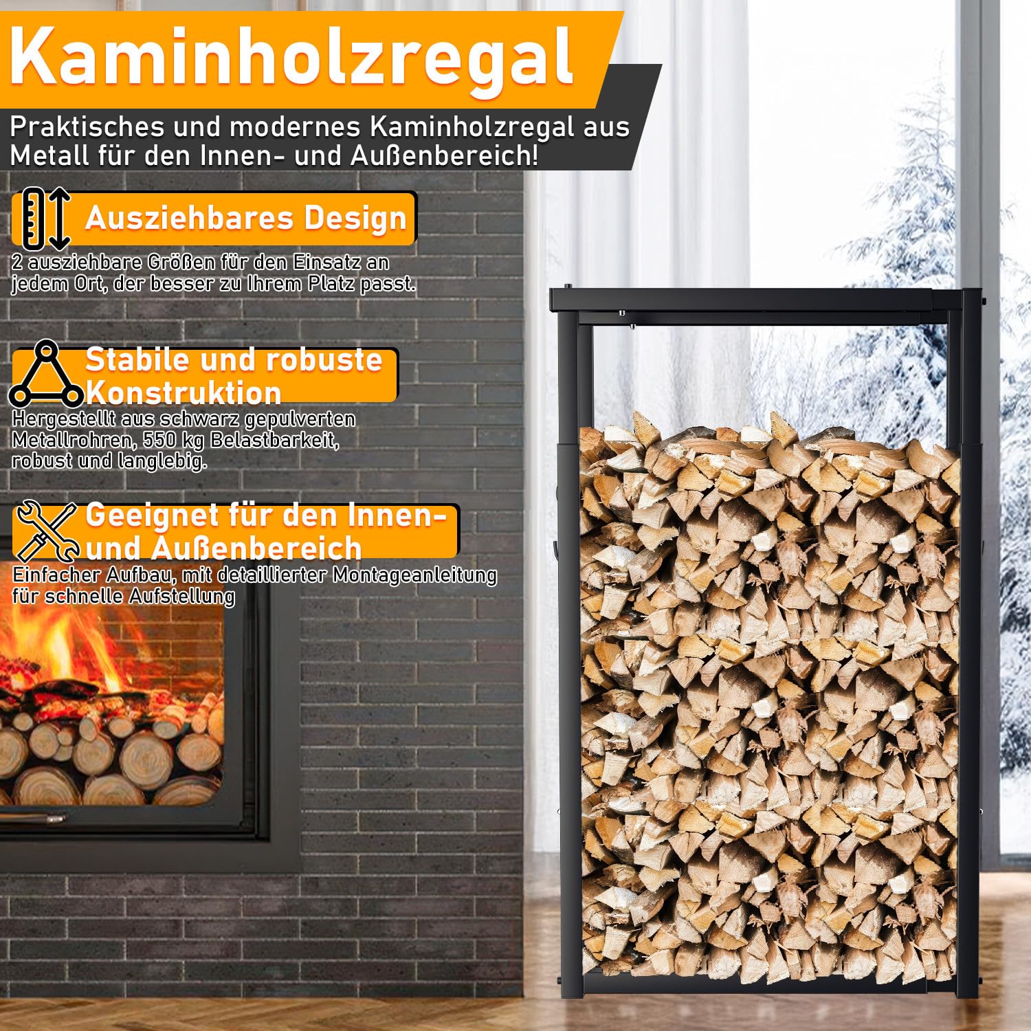 Endlich Ordnung im Brennholz! Dieses Metallregal ist super praktisch - du kannst Länge (60-100 cm) und Höhe (100-150 cm) in 9 Stufen anpassen. Hält bis zu 550 kg aus und hat unten ein belüftetes Design, damit das Holz schön trocken bleibt. Mit 4 Haken für Zange, Schürhaken & Co. - alles griffbereit! Aufbau ist easy, alles Nötige ist dabei. Egal ob im Wohnzimmer, Wintergarten oder draußen unter dem Vordach - dieses Regal macht überall eine gute Figur und hält dein Feuerholz ordentlich und trocken. Perfekt für alle Kamin- und Ofenbesitzer, die nicht jedes Mal nach draußen latschen wollen, wenn's nachgelegt werden muss. Einfach clever!