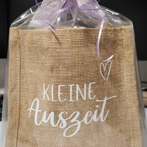 Perfekt für alle, die sich eine kleine Pause gönnen wollen! Diese charmante Jutetasche mit der Aufschrift 'Kleine Auszeit' und niedlichem Herz-Design ist dein neuer Alltagsbegleiter. Hergestellt aus 100% natürlichem Leinen in schönem Beige, ist sie nicht nur robust, sondern auch umweltfreundlich. Mit ihren stabilen Tragegriffen und der praktischen Größe ist sie ideal für den Einkauf oder als besondere Geschenkverpackung. Das handschriftliche Design verleiht ihr einen persönlichen Touch, während die natürliche Jutestruktur für angenehme Haptik sorgt. Ob für den Biomarkt, als Verpackung für ein Wellness-Geschenk oder einfach als stylische Tasche für unterwegs - hier passt einfach alles rein, was für eine kleine Auszeit wichtig ist!