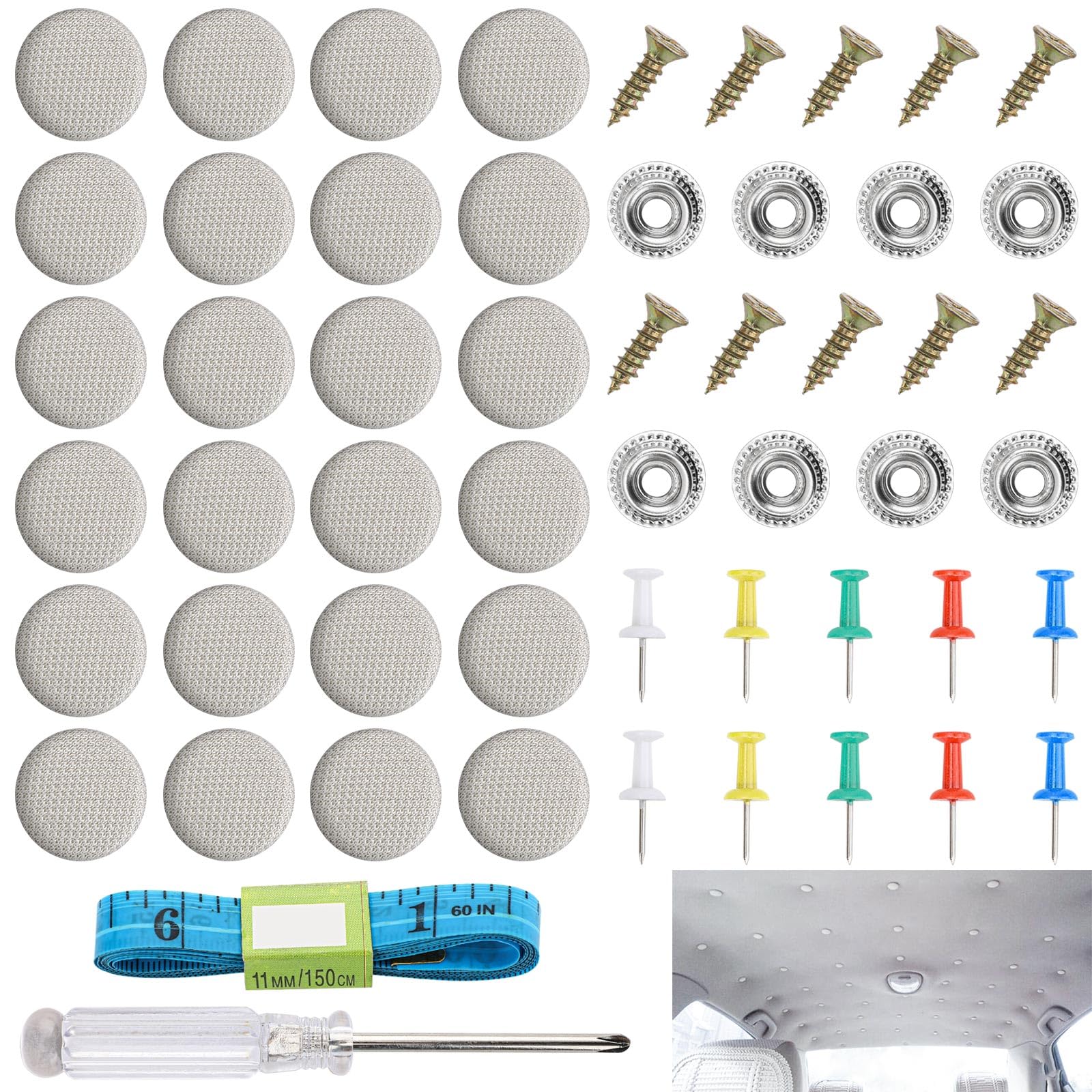 Dein Autodach hängt durch? Kein Problem mit diesem 100-teiligen Reparatur-Set! Statt teurer Werkstattbesuche kannst du deinen Dachhimmel jetzt einfach selbst reparieren. Die Reparaturknöpfe aus Netzgewebe sehen aus wie das Original und haben eine rostfreie Beschichtung. Einfach mit dem beiliegenden Schraubendreher die Schrauben anbringen und die grauen Knöpfe aufdrücken - ohne Werkzeug und ohne das Dach zu beschädigen. Optimaler Installationsabstand: 12-15cm zwischen den Knöpfen. Passt für die meisten Fahrzeuge - Autos, LKWs, Busse oder Wohnmobile. Im Set enthalten: 100 Reparaturknöpfe, 100 farbige Pins, 1 Maßband und 1 Schraubendreher. So sparst du hunderte Euro an Werkstattkosten und dein Dach sieht wieder aus wie neu. Die Reparatur hält Jahre und verhindert weiteres Herabhängen. Einfacher geht's nicht!