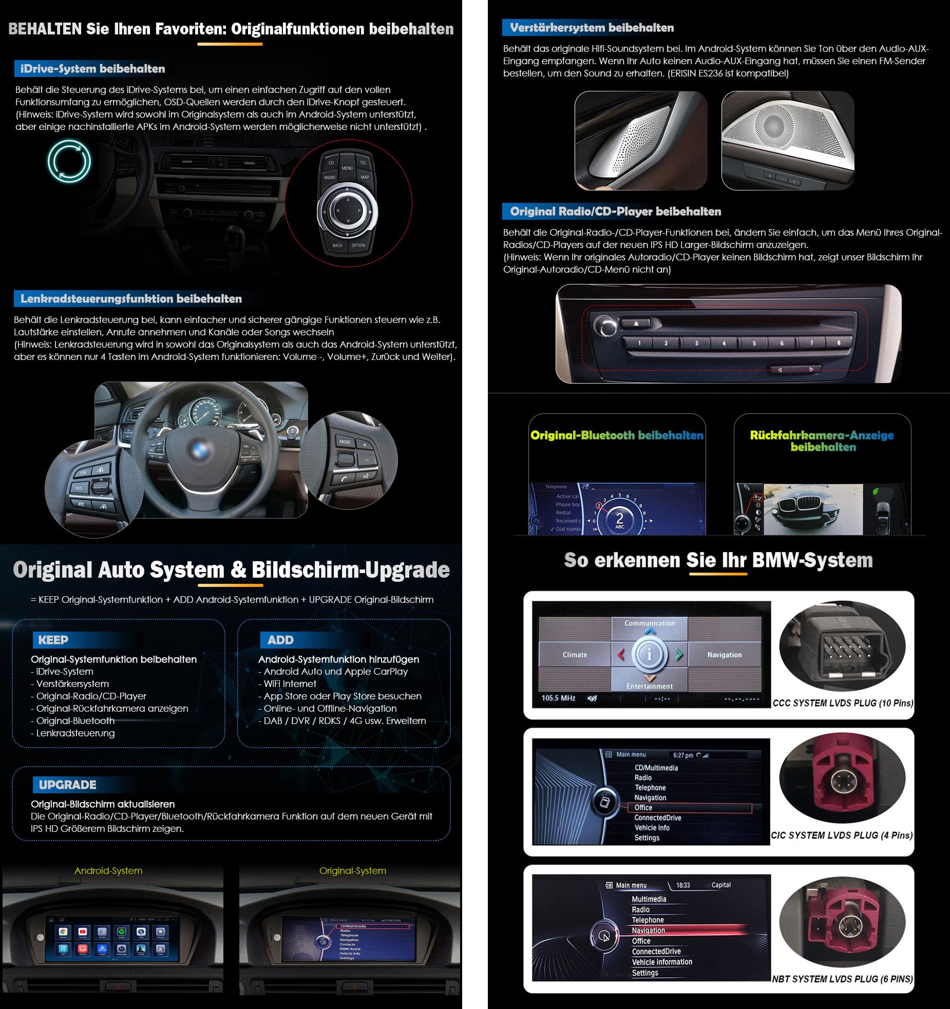 BMW-Fahrer, aufgepasst! Dieses Android 14 Autoradio macht deinen alten BMW richtig modern. Mit 8.8 Zoll Touchscreen, 4GB RAM und 64GB Speicher ist das Ding schneller als so manches Smartphone! Kompatibel mit BMW 3er E90/E91/E92/E93, 5er E60/E61 und 6er E63/E64 mit CIC-System. Das Beste: Wireless Apple CarPlay und Android Auto sind schon integriert - einfach Handy verbinden und los! Navi? Klar, offline mit vorinstallierten Karten oder online mit Google Maps. Internet? Über 4G SIM-Karte oder WLAN. Und das Coole: Dein original iDrive Controller funktioniert weiter, genauso wie Lenkradbedienung und alle Fahrzeuginfos. Sound-Fans freuen sich über den integrierten DSP Verstärker mit 16-Band Equalizer. Rückfahrkamera anschließen? Kein Problem! DAB+ Radio, TPMS und Dashcam werden auch unterstützt. Einfach einbauen - originale Kabel bleiben unangetastet. Dein BMW fühlt sich an wie ein nagelneues Modell! Ob Musik streamen, navigieren oder telefonieren - alles geht easy über den großen Touchscreen. Endlich modernes Infotainment in deinem BMW! Wichtig: Nur für CIC-Systeme ab 2009, vorher bitte System checken!