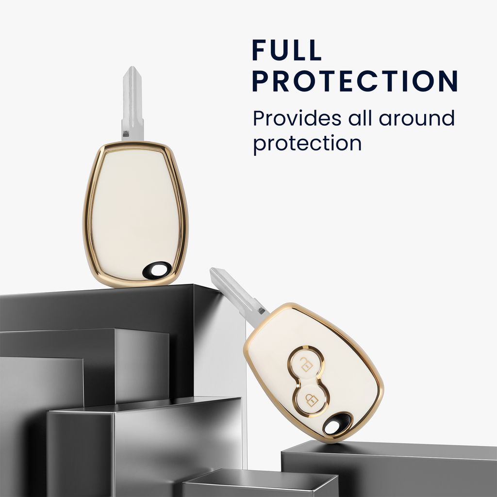 Schütz deinen Autoschlüssel und mach ihn gleichzeitig viel stylischer! Diese Schlüsselhöhle passt perfekt für Renault und Dacia Modelle mit 2-Tasten Schlüssel. Kompatibel mit Kwid, Symbol, Trafic, Sandero, Logan, Master, Modus, Twingo, Kangoo und Dacia Sandero, Logan, Duster. Aus flexiblem TPU-Material - biegsam, reißfest und passt sich perfekt an deinen Schlüssel an. Das Metallic Carbon Design in Gold-Schwarz sieht einfach mega edel aus. Alle Tasten sind gut erreichbar und auf der Hülle aufgedruckt. Mit strukturierter Oberfläche für angenehme Haptik und besseren Griff. Inklusive coolen Key Ring Anhänger - etwas fummelig zu montieren, aber das Ergebnis lohnt sich! Dein Schlüssel wird damit zum echten Hingucker.