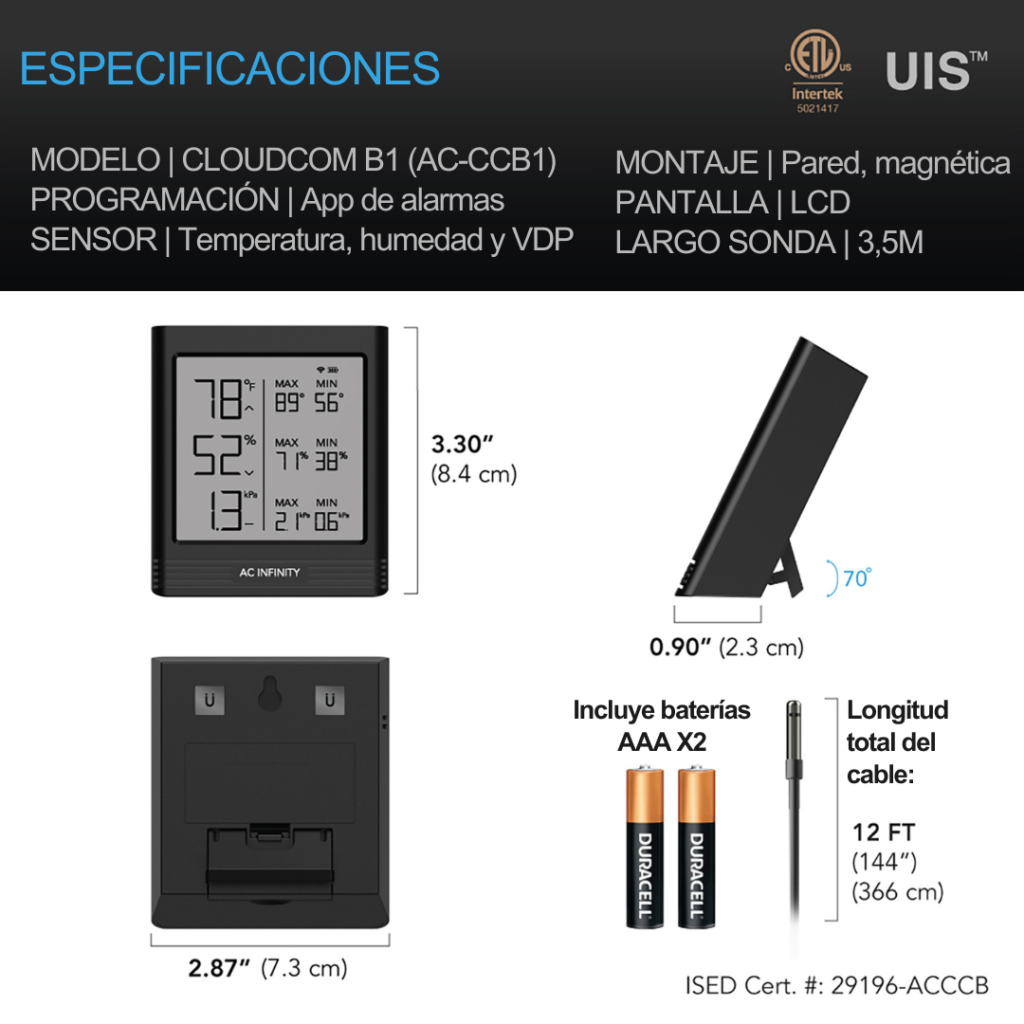 Das AC Infinity CLOUDCOM B1 ist kein gewöhnliches Hygrometer - es ist dein smarter Begleiter für das perfekte Raumklima! Mit präziser Stahl-Thermolegierungssonde misst es Temperatur und Luftfeuchtigkeit millimetergenau. Das LCD-Display mit Hintergrundbeleuchtung zeigt dir alle wichtigen Daten auf einen Blick. Aber das Beste: Per Bluetooth verbindest du es mit der AC Infinity App und hast von überall Zugriff auf die Messwerte. Du kannst Alarme einstellen, bekommst Push-Benachrichtigungen bei kritischen Werten und siehst historische Daten als übersichtliche Graphen. Ob für Growräume, Gewächshäuser, Terrarien, Keller oder Gitarrenzimmer - dieses Gerät behält immer den Überblick. Du kannst es aufstellen, an die Wand hängen oder magnetisch befestigen. Selbst wenn der Strom mal ausfällt, merkt sich das Gerät alle Einstellungen. Profi-Messungen für zuhause - einfach und smart!