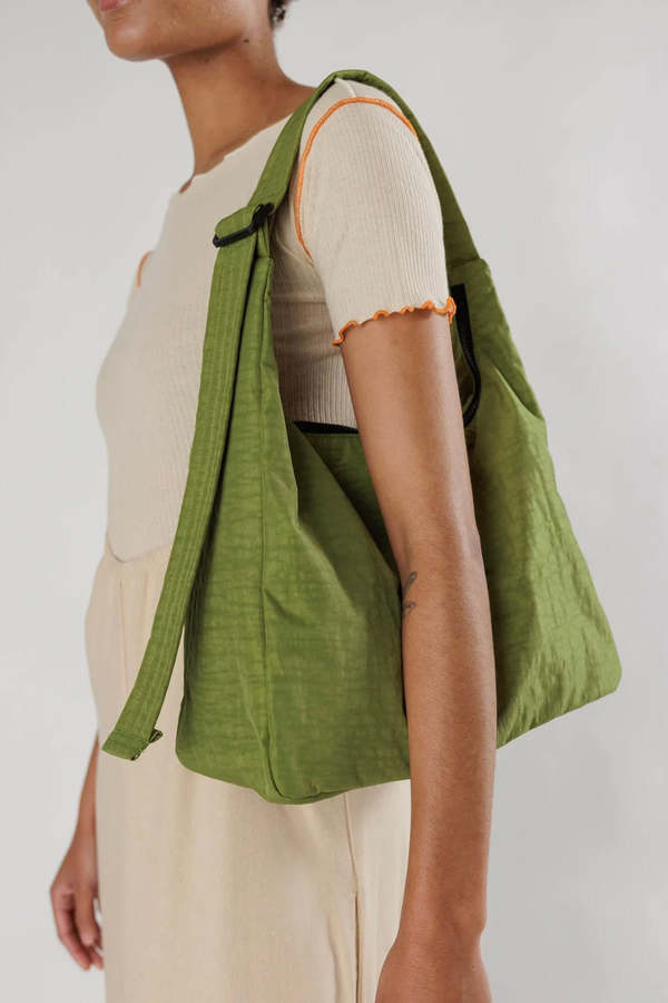 Die BAGGU Nylon-Schultertasche ist dein perfekter Begleiter für jeden Tag! Super leicht und lässig, aber dennoch strukturiert - so mag man's. Mit einer praktischen Innentasche mit Reißverschluss, damit alles seinen Platz hat. Dein Laptop bis 13/14 Zoll findet hier bequem Platz. Der verstellbare, gesteppte Riemen ist 69,8 cm lang und lässt sich perfekt an deine Bedürfnisse anpassen. Mit den Maßen 26,7 x 35,6 x 10,2 cm ist sie groß genug für all deine Essentials, aber nicht zu klobig. Hergestellt aus recyceltem, schwerem Nylon - gut für die Umwelt und langlebig! Das Futter besteht aus recyceltem Ripstop-Nylon, was die Tasche besonders robust macht. Egal ob zur Arbeit, zum Einkaufen oder für einen Stadtbummel - diese Tasche sieht nicht nur gut aus, sondern ist auch mega praktisch. Schmeiß einfach alles rein was du brauchst und los geht's! Die Qualität spürt man sofort, und das Design ist zeitlos schön. Perfekt für alle, die Wert auf Nachhaltigkeit und Stil legen. Einfach über die Schulter werfen und du bist ready for the day!