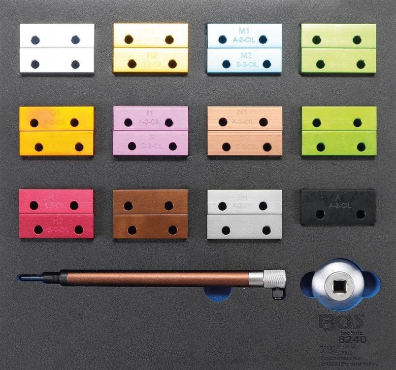 Im Lieferumfang findest du alles, was du brauchst: Zwei Messadapter für die Kolbenhöhe (wie OEM 1860992000), zwei Nockenwellen-Justierwerkzeuge (wie OEM 1860985000) und einen Spannrollenschlüssel (wie OEM 1860987000).