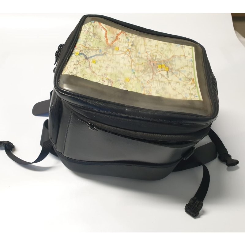Teflonbeschichtetes Obermaterial - leicht abwaschbar. Rutschfester Silikonboden hält sicher auf dem Tank. Hauptfach wasserdicht, plus Kleinteilefächer innen und außen mit Sichtfenster.