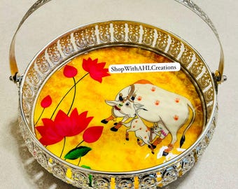 Zur Feier des Karwa Chauth Festes oder anderer religiöser Anlässe ist dieses wunderschöne Thali-Set aus Messing genau das Richtige! Im Set enthalten sind: eine runde Thali (28 cm Durchmesser), ein Lota (Wassertopf), ein Channi (Sieb), eine Diya (Öllampe) und ein Chunni (Tuch). Alles, was du für die traditionellen Rituale brauchst, in einem Set! Die feinen Verzierungen und die hochwertige Verarbeitung machen das Set zu einem besonderen Geschenk für verheiratete Frauen, zur Hochzeit oder zu Festen wie Diwali. Einfach aufstellen, die Rituale durchführen und die besondere Atmosphäre genießen. Ein Stück Tradition für dein Zuhause!