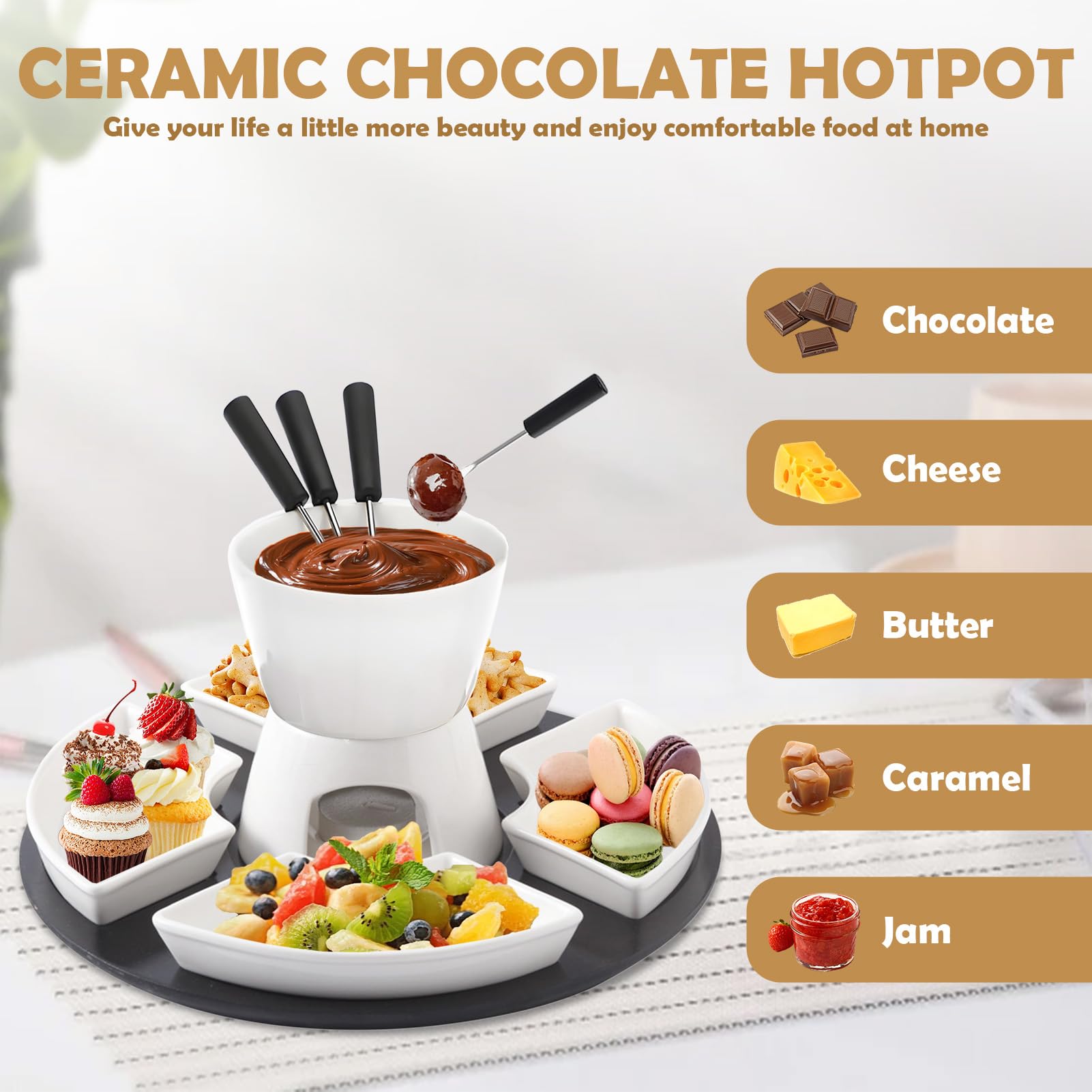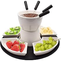 Genieße gemütliche Fondue-Abende mit diesem hochwertigen Keramik-Set! Perfekt für Schokoladen-, Käse- oder Butterfondue - das 11-teilige Set hat alles was du brauchst. Die weiße Keramik-Schüssel ist hitzebeständig bis 220°C und wird durch ein Teelicht erwärmt (nicht im Lieferumfang). Enthalten sind 4 keramische Tauchschalen, 4 Edelstahl-Gabeln mit hitzebeständigen Griffen und ein schickes schwarzes MDF-Tablett. Das zerlegbare Design macht die Aufbewahrung super einfach und die Reinigung ist spülmaschinenfest. Ob für romantische Abende zu zweit, Familienfeiern, Geburtstage oder Weihnachtsabende - dieses Set sorgt für gemütliche Stunden. Im Sommer mit frischen Früchten, im Winter mit warmem Käse - es ist einfach immer die richtige Wahl. Achtung: Bitte beachtet die Hitzeabdeckung und stellt das Set auf eine feuerfeste Unterlage. Ein echter Party-Hit der garantiert für Begeisterung sorgt!