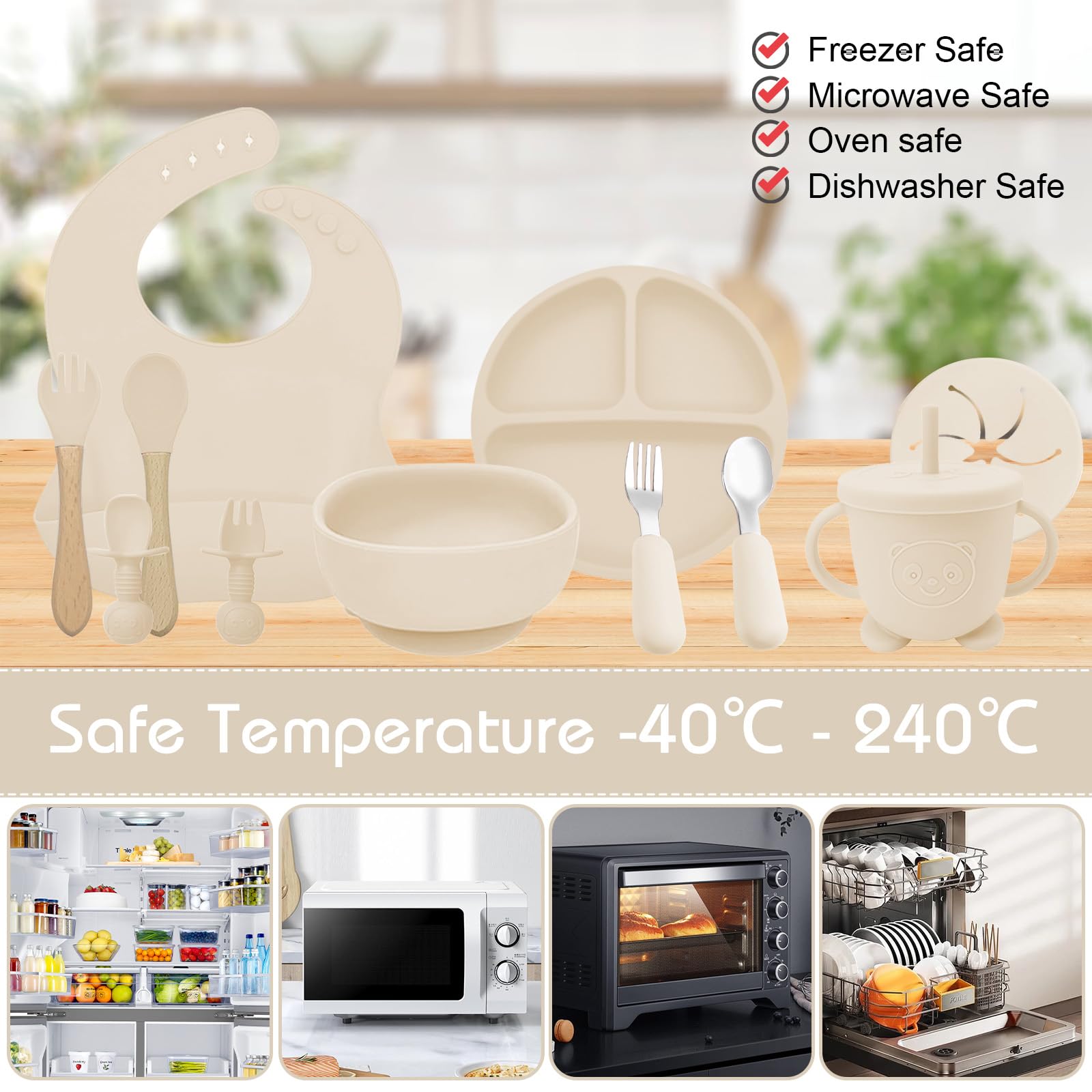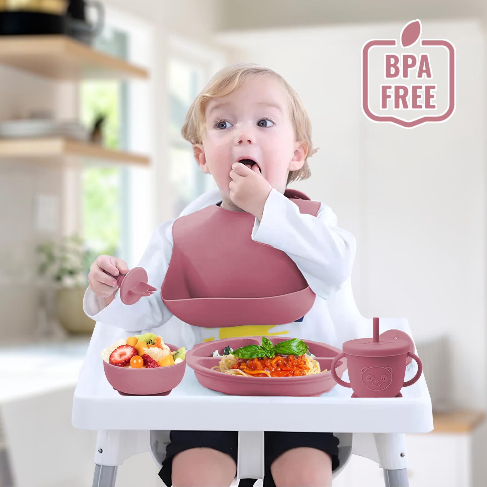 Alles für die ersten Essversuche deines Babys! Dieses komplett 14-teilige Set aus lebensmittelechtem Silikon (BPA-frei) enthält: 1 verstellbares Lätzchen, 1 Teller mit Saugnapf, 1 Schüssel mit Saugnapf, 1 2-in-1-Becher, 1 Snackdeckel, 1 Fruchtsauger, 1 Eiswürfelbehälter, 1 Beißring, 2 wasserdichte Langarm-Lätzchen, 2 Löffel und 2 Gabeln. Die starken Saugnäpfe halten alles an Ort und Stelle. Besonders praktisch: Der Teller hat 3 Fächer, damit sich das Essen nicht vermischt. Spülmaschinenfest, mikrowellengeeignet und für Babys ab 3 Monaten. In süßem Hellrosa - das perfekte Geschenk zur Geburt oder für den Beikoststart!