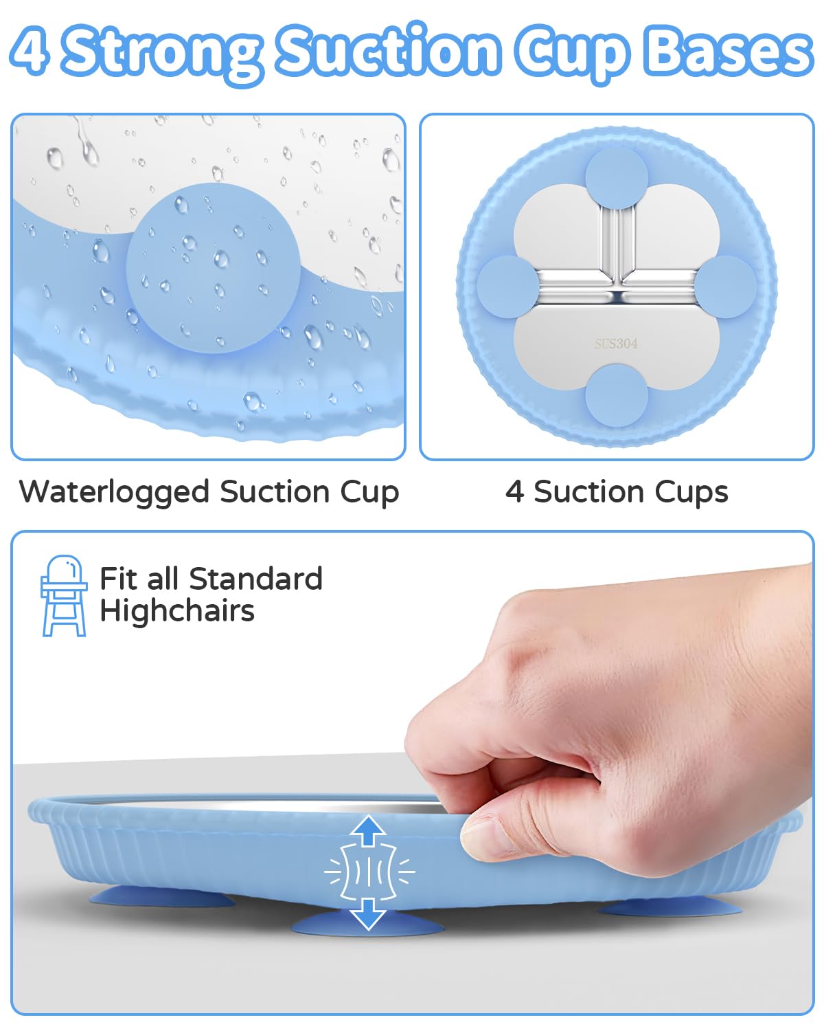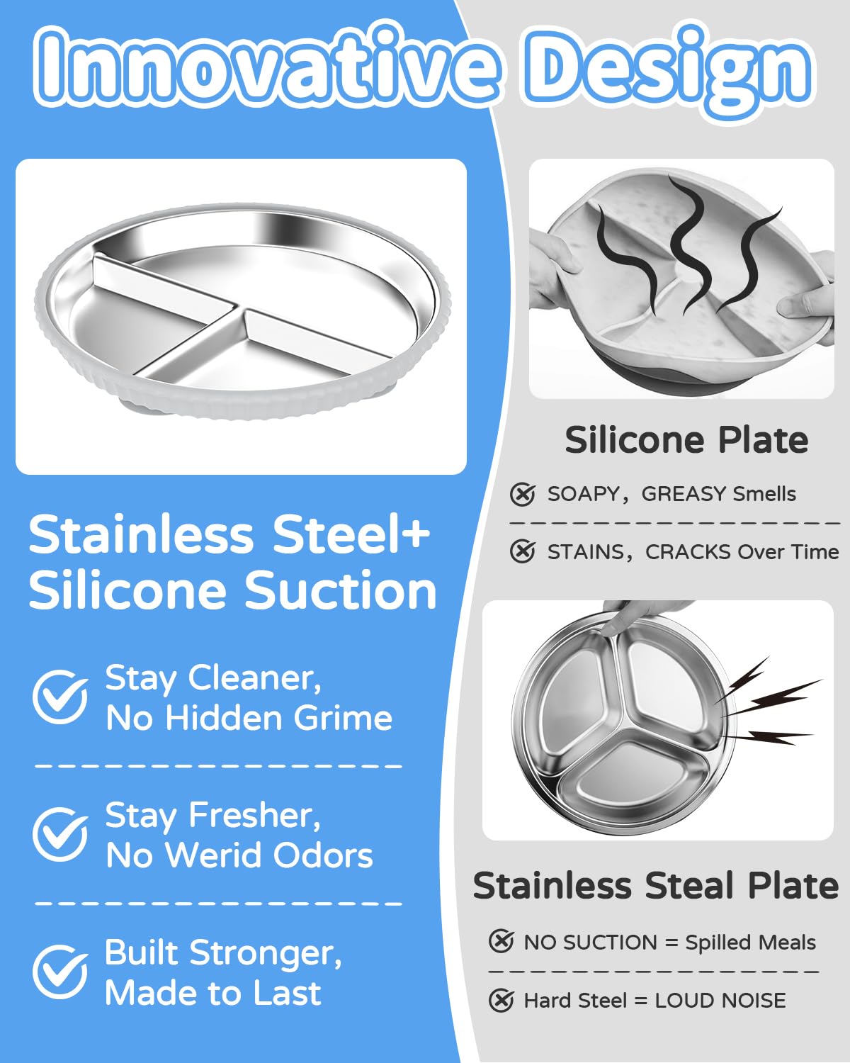 Mama, Papa - dieser Baby-Teller ist ein Game-Changer! Aus hochwertigem Edelstahl 304 mit weicher Silikonhülle - absolut sicher und BPA-frei! Der starke Saugnapf hält den Teller bombenfest auf dem Tisch - kein Umkippen mehr! Einfach etwas Wasser unter den Saugnapf geben und festdrücken - schon kann dein Kleinkind selbstständig essen ohne Chaos. Die praktische Dreiteilung ermöglicht verschiedene Speisen getrennt - Hauptgericht, Gemüse und Nachtisch passen perfekt rein. Super leicht zu reinigen - einfach in die Spülmaschine! Die glatte Edelstahl-Oberfläche nimmt keine Gerüche oder Farben an - selbst Karottenbrei hinterlässt keine Spuren! In grau-blau erhältlich - stylisch und praktisch. Perfekt für Zuhause oder unterwegs. Ein ideales Geschenk zur Geburt oder zum ersten Geburtstag!