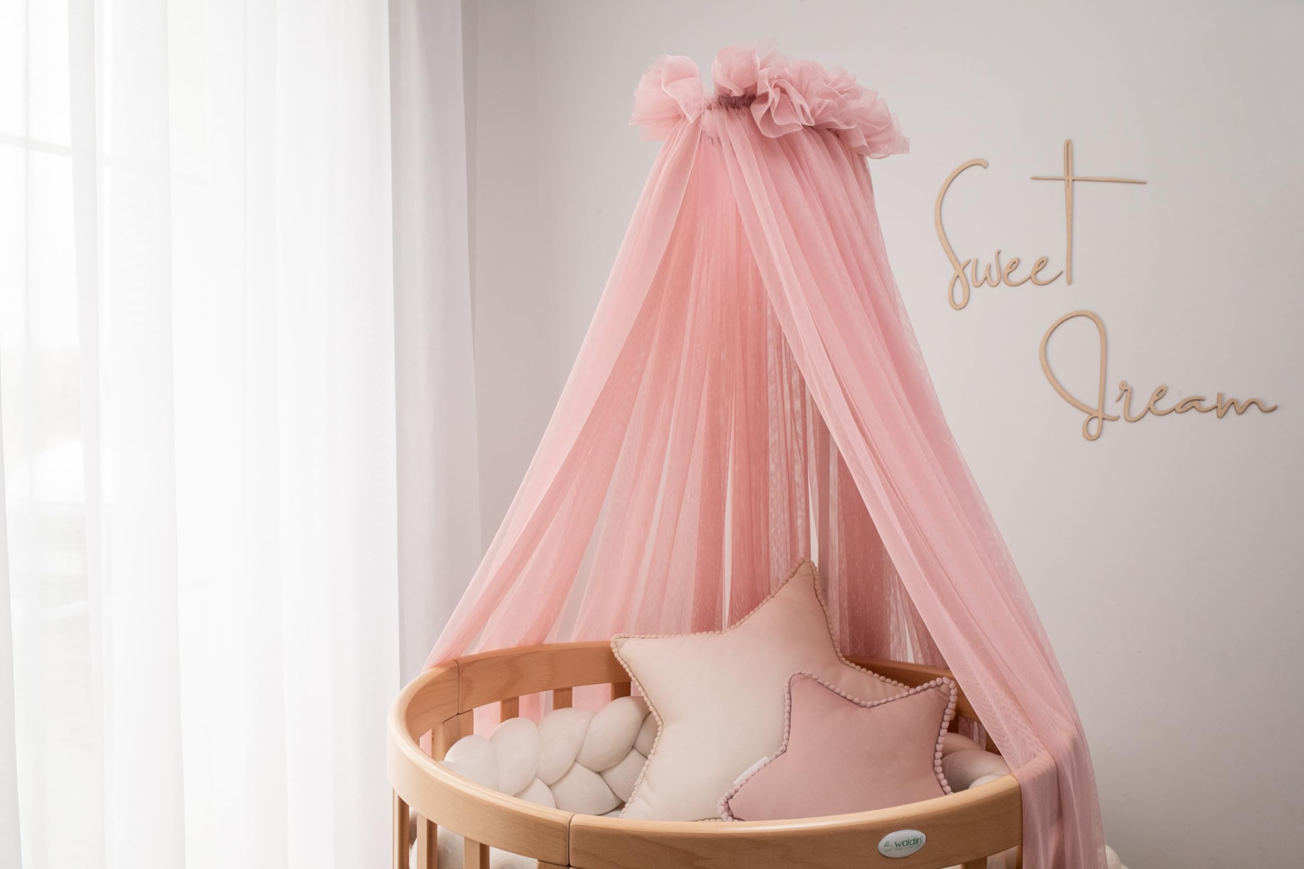 So ein traumhafter Himmel fürs Babybett! In zartem Rosa mit Spitzenverzierung - wie aus nem Märchen.\\n\\nAus atmungsaktivem Netzgewebe - die Kleinen kriegen genug Luft aber sind vor Insekten und starkem Licht geschützt. Mit 120x200 cm passt er an die meisten Babybetten.\\n\\nDie Montage ist super einfach - Halterung ans Bett, Himmel dran, fertig! Schafft eine gemütliche, geschützte Schlafumgebung.\\n\\nKann auch als Sichtschutz oder Moskitonetz verwendet werden. Sieht nicht nur hübsch aus, sondern ist auch praktisch.\\n\\nPerfekt für kleine Prinzessinnen - aber auch Jungs finden's toll unter dem Sternenhimmel zu schlafen!\\n\\n• Farbe: Rosa\\n• Maße: 120x200 cm\\n• Material: Tüll/Netzgewebe\\n• Inklusive Halterung\\n• Einfache Montage\\n• Für Babybetten