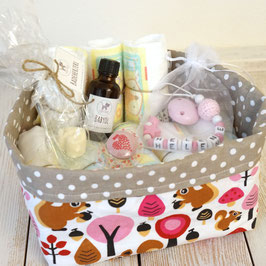 Das perfekte Geschenk zur Babyparty! Dieser niedliche Babykorb aus hochwertigem Naturholz ist nicht nur super praktisch, sondern auch ein echter Hingucker. Mit 54,5x34x23cm bietet er genug Platz für Kleidung, Spielzeug oder Windeln. Die Montage ist kinderleicht - vorgebohrte Löcher und mitgeliefertes Werkzeug machen's einfach. Im Lieferumfang: 1 Baby-Aufbewahrungskorb, 5 süße Baby-Kleiderbügel, 1 Rosette zur Dekoration und das Montagewerkzeug. So kannst du den Korb ganz individuell gestalten. Mit Tragegriff leicht zu transportieren und vielseitig einsetzbar - ob im Kinderzimmer oder als Fotohintergrund für die Babyparty. Ein Geschenk, das nicht nur gut aussieht, sondern auch praktisch ist. Mach deinen Liebsten eine Freude mit diesem besonderen Präsent!