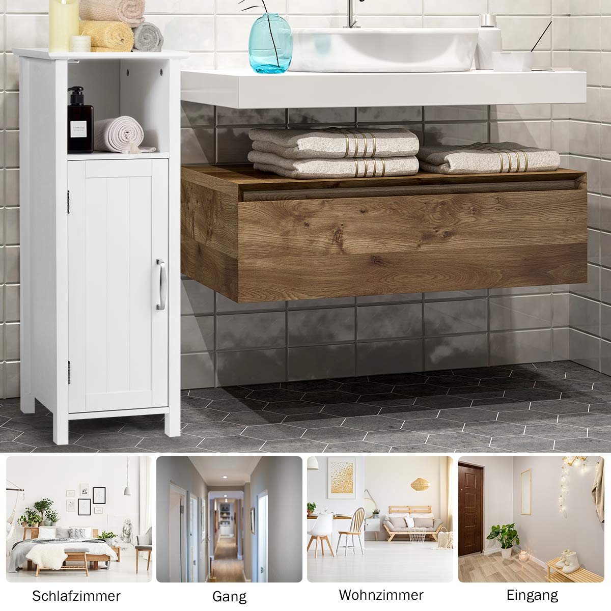 Platzprobleme im Bad? Dieser schmale Schrank ist die Lösung! Mit nur 18x19,5cm Grundfläche findet er selbst in die kleinsten Ecken und bietet trotzdem jede Menge Stauraum.\\n\\nDas bietet dir dieser praktische Schrank:\\n• 80cm Höhe - nutzt den vertikalen Raum optimal\\n• 5 Ablageebenen - für Handtücher, Kosmetik & Co\\n• Verstellbare Regale - individuell anpassbar\\n• Toilettenpapierhalter - integriert und praktisch\\n• Magnetverschluss - Tür bleibt sicher geschlossen\\n\\nOben eine Ablage für deine Kosmetik, in der Mitte Platz für Toilettenpapier und unten Regale für Handtücher und Pflegeprodukte - alles organisiert und griffbereit! Perfekt für Gäste-WC, kleine Badezimmer oder als zusätzlicher Stauraum. Einfach aufstellen und sich über mehr Ordnung im Bad freuen!