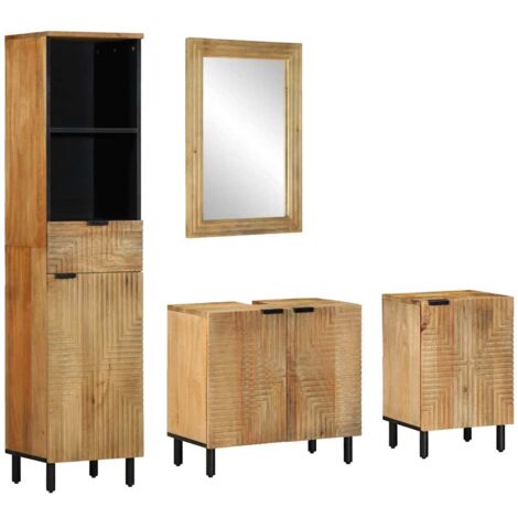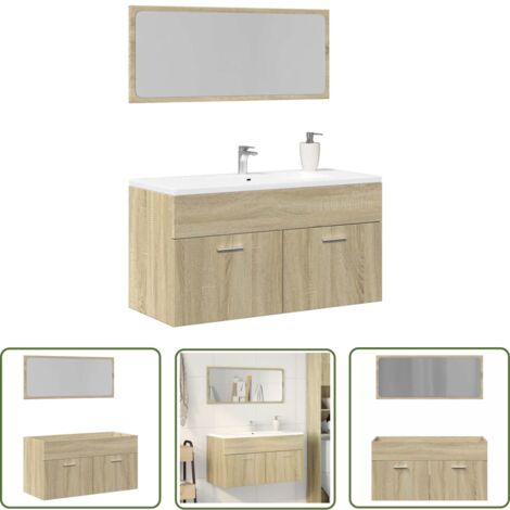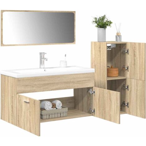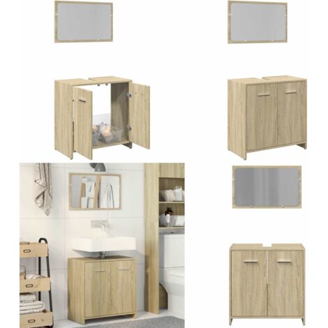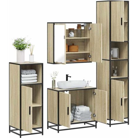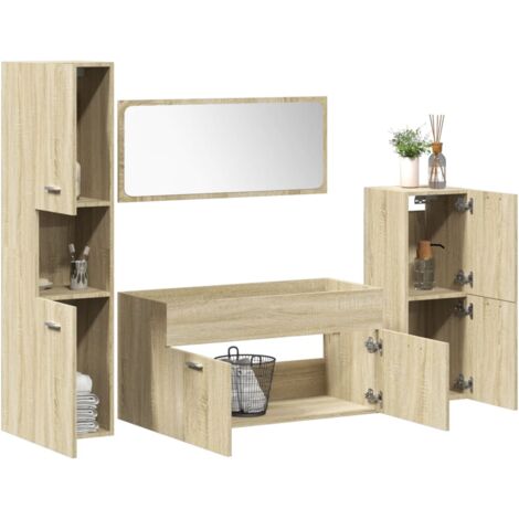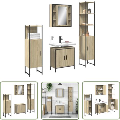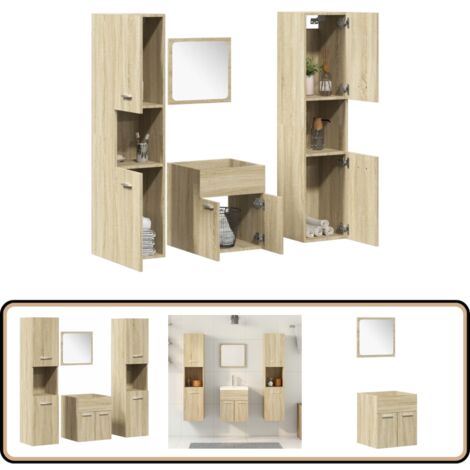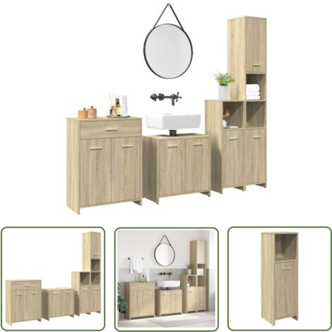 Das 4-teilige Badmöbel-Set von Massbinet in edler Sonoma-Eiche macht dein Bad zum Wohlfühl-Ort! Aus hochwertigem Massivholz gefertigt, das nicht nur super stabil und langlebig ist, sondern auch feuchtigkeitsbeständig - perfekt fürs Badezimmer also! Das Set besteht aus einem Badschrank (60x33x80 cm), einem Waschbeckenunterschrank (60x33x60 cm), einem Midischrank (30x30x95 cm) und einem hohen Hockschrank (30x30x183,5 cm) - damit hast du unendlich viel Stauraum für all deine Badezimmer-Utensilien! Das klare, elegante Design mit den praktischen Griffen an jeder Tür passt in jedes Badezimmer und sieht einfach zeitlos schön aus. Einfach zu reinigen mit einem feuchten Tuch - und wichtig: Zur Sicherheit unbedingt die mitgeliefete Wandhalterung verwenden, damit nichts umkippen kann. So wird Aufräumen zum Kinderspiel und dein Bad sieht immer ordentlich aus!