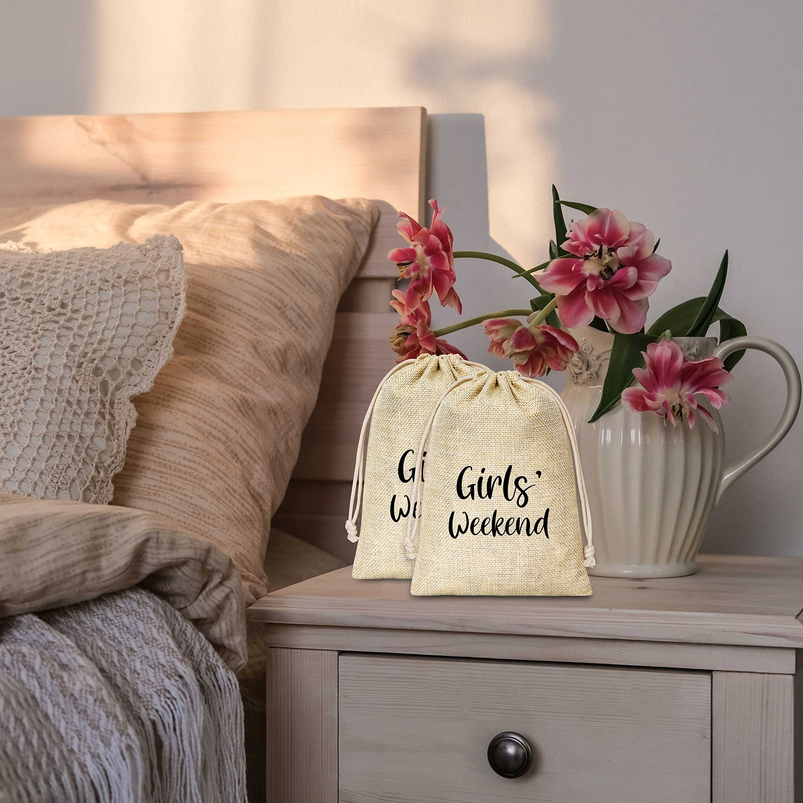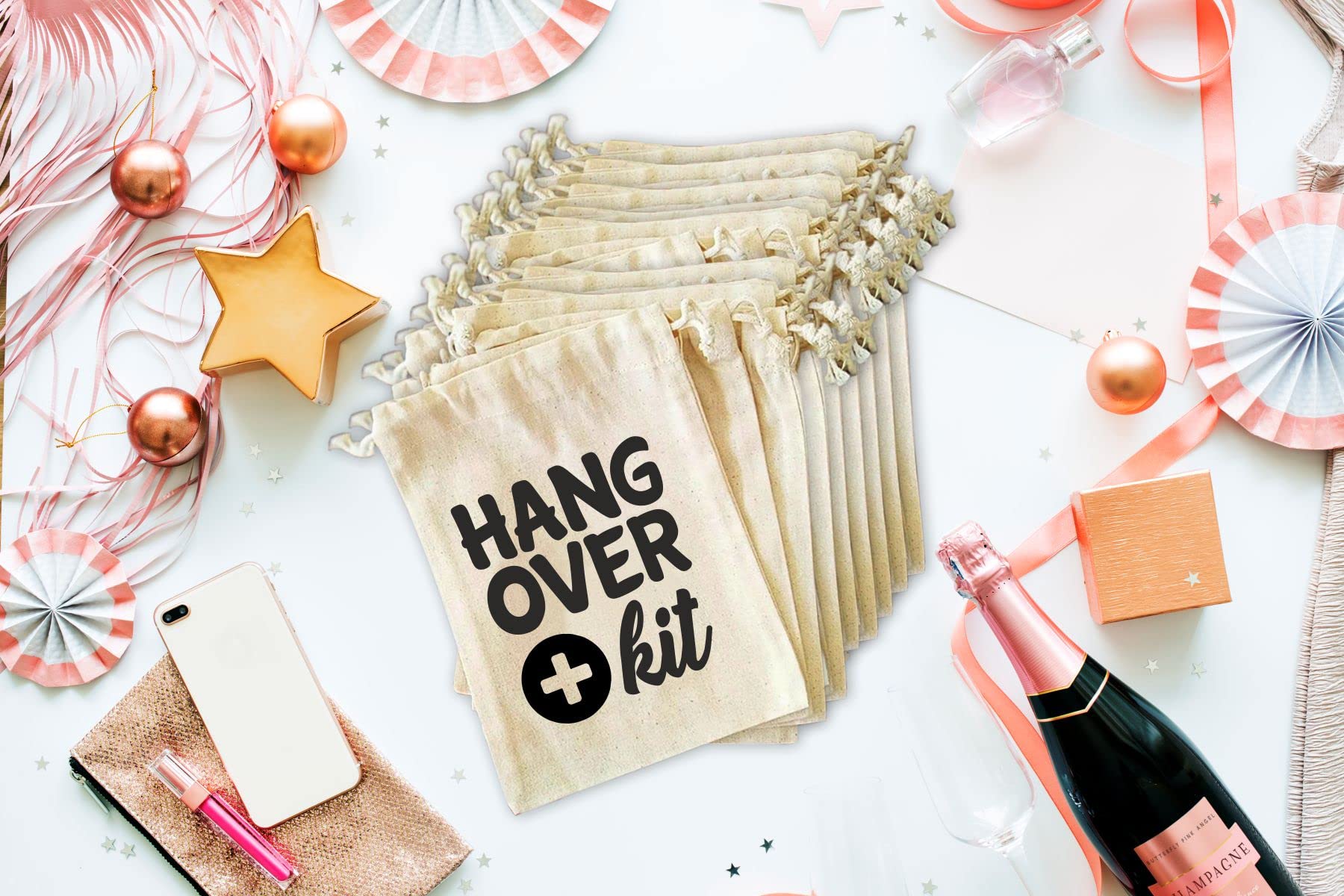 Perfekt für jede Brautparty und Junggesellinnenabschied! Dieses Set mit 5 stylischen Hangover Kit Bags ist die ideale Überraschung für Brautjungfern und Gäste. Die Beutel aus hochwertiger Baumwoll-Leinen-Mischung sind beidseitig bedruckt und mit praktischem Kordelzug versehen. Mit den Maßen 18,3x13,2 cm perfekt für Lippenstifte, Schlüssel, Mundwasser, Lippenbalsam und andere wichtige Kleinigkeiten. Nach der Party helfen sie, alles sicher zu verstauen und sind ein tolles Andenken an den besonderen Tag. Vielseitig verwendbar auch als Make-up-Tasche, Kulturbeutel oder Reiseorganizer. Ein kreatives und persönliches Geschenk, das garantiert gut ankommt - ob für die beste Freundin, Schwester oder alle Brautjungfern!