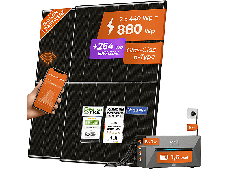 Wow, mit diesem Solarway Balkonkraftwerk produzierst du deinen eigenen Strom - ganz einfach an der Steckdose! Das Komplettset mit 880Wp Leistung und 1,9kWh Speicher von EcoFlow ist einfach genial. All-in-One Design: Wechselrichter und Batterie in einem Gerät, spart Platz und reagiert blitzschnell auf Leistungsänderungen. Du kannst bis zu 800W ins Heimnetz einspeisen (genehmigungsfrei!) und mit der EcoFlow App siehst du in Echtzeit, wie viel Strom du produzierst und sparst. Enthalten sind 2x 440Wp JaSolar black Module, die EcoFlow STREAM Max Einheit, Schutzkontakt-Kabel und Solarkabel-Verlängerungen. Optional gibt's Halterungen für Flachdach, Balkon oder Ziegeldach. Einfach aufbauen, Kabel in die Steckdose und schon sparst du Stromkosten! Perfekt für Mieter und Eigenheimbesitzer, die unkompliziert in Solarenergie einsteigen wollen.