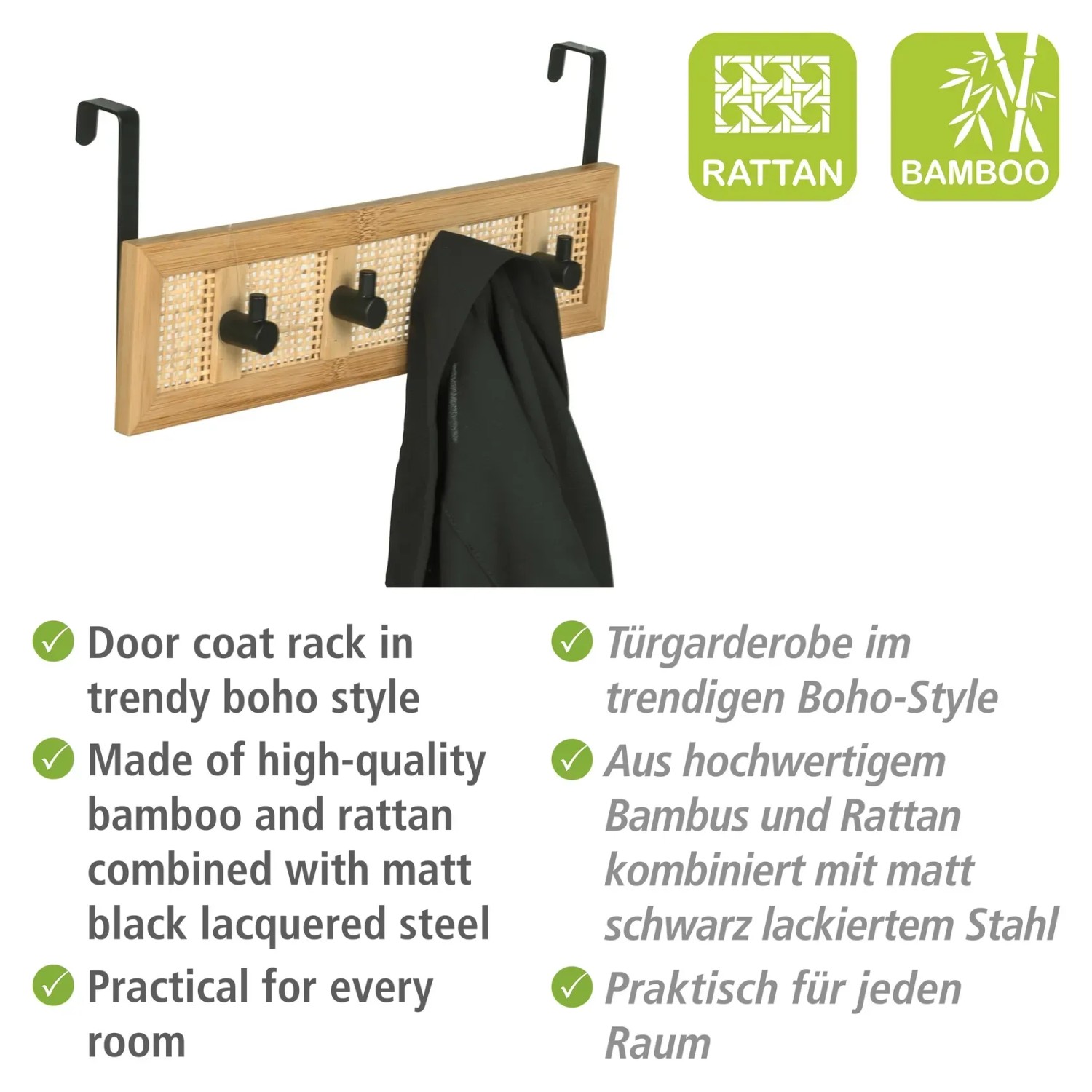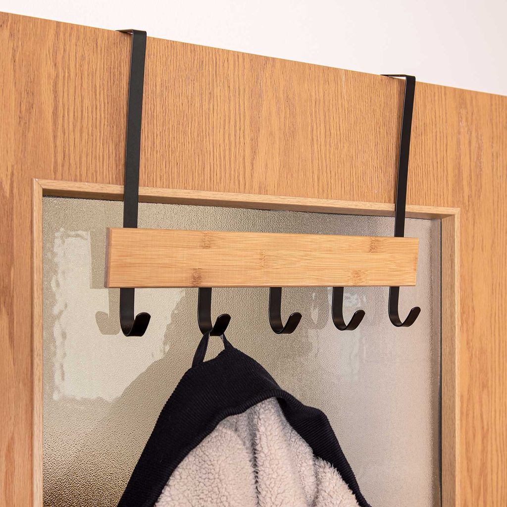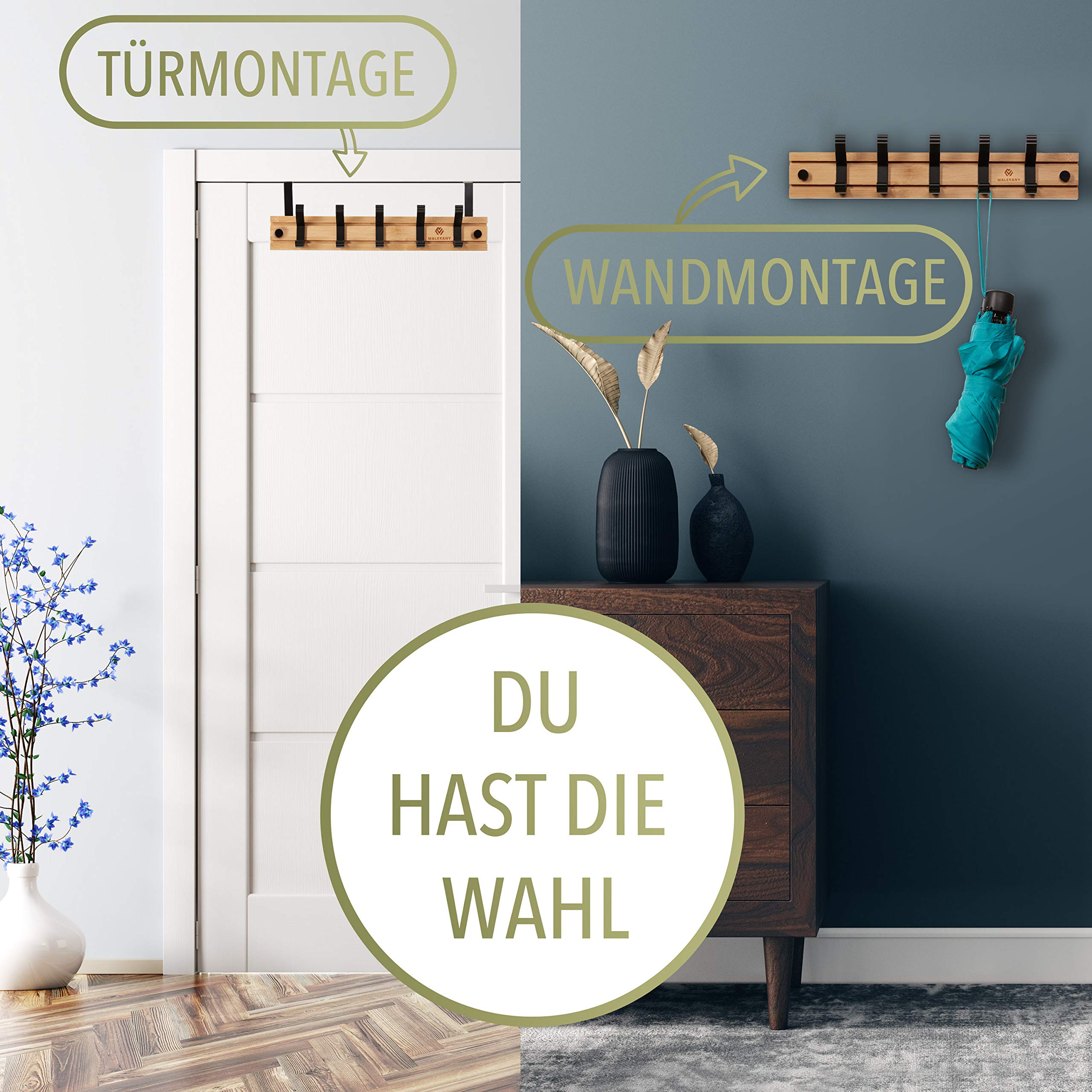 Schluss mit Kleiderbergen auf dem Stuhl! Diese stylische Türgarderobe aus Bambus bringt Ordnung in dein Zuhause. Mit 5 voll verstellbaren Haken, die du nach Belieben verschieben kannst - perfekt für voluminöse Winterjacken neben schmalen Handtüchern. Jeder Haken trägt bis zu 3kg, also auch schwere Kleidungsstücke sind kein Problem. Aus nachhaltigem Bambus gefertigt - härter als die meisten Hölzer und komplett kompostierbar. Die elegante Kombination aus Bambus und tiefschwarzen Elementen sieht einfach klasse aus. Einfache Montage: Entweder an der Tür (bis 2cm Türfalzstärke) mit den mitgelieferten Türprotektoren oder an der Wand. Inklusive Moosgummi-Auflage, damit weder die Tür verkratzt noch was klappert. Ideal auch fürs Badezimmer - die hochwertigen Materialien halten selbst hoher Luftfeuchtigkeit stand. Minimalistisches Design, maximale Funktionalität. Mach deine Tür zum organisierten Kleiderparkplatz!