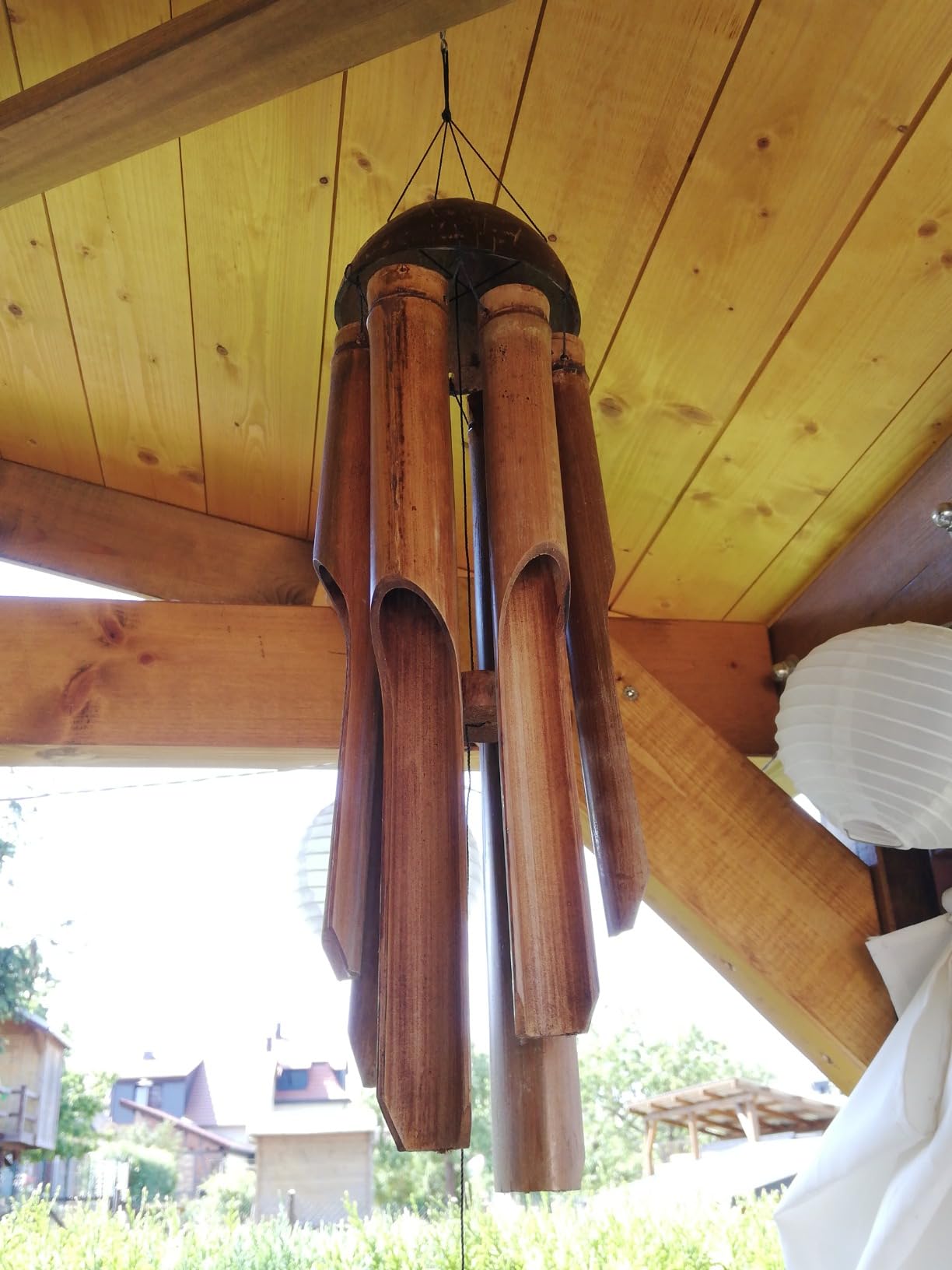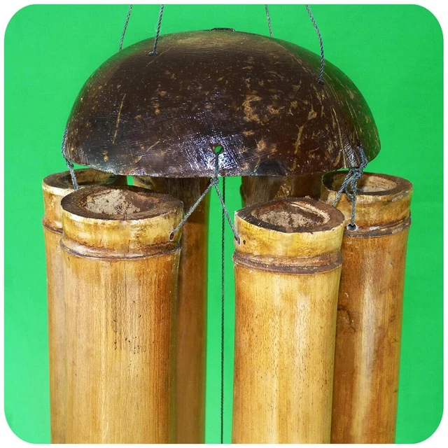 Bring balinesische Entspannung in deinen Garten! Dieses wunderschöne Windspil aus Bali besteht aus natürlichen Materialien: Bambus-Röhren und Kokosnussschale mit einem handgeschnitzten Kranich - dem 'Vogel des Glücks'. Die 65cm lange Klangdekoration erzeugt sanfte, beruhigende Töne die für positive Energie sorgen. Jedes Stück ist ein Unikat - kleine Abweichungen machen den besonderen Charakter aus. Perfekt für Garten, Terrasse oder Wohnzimmer. Nach Feng-Shui-Prinzipien erhöht es das Chi und verbreitet harmonische Schwingungen. Fair gehandelt aus Indonesien - mit jedem Kauf unterstützt du traditionelles Kunsthandwerk. Hol dir ein Stück Bali nach Hause!