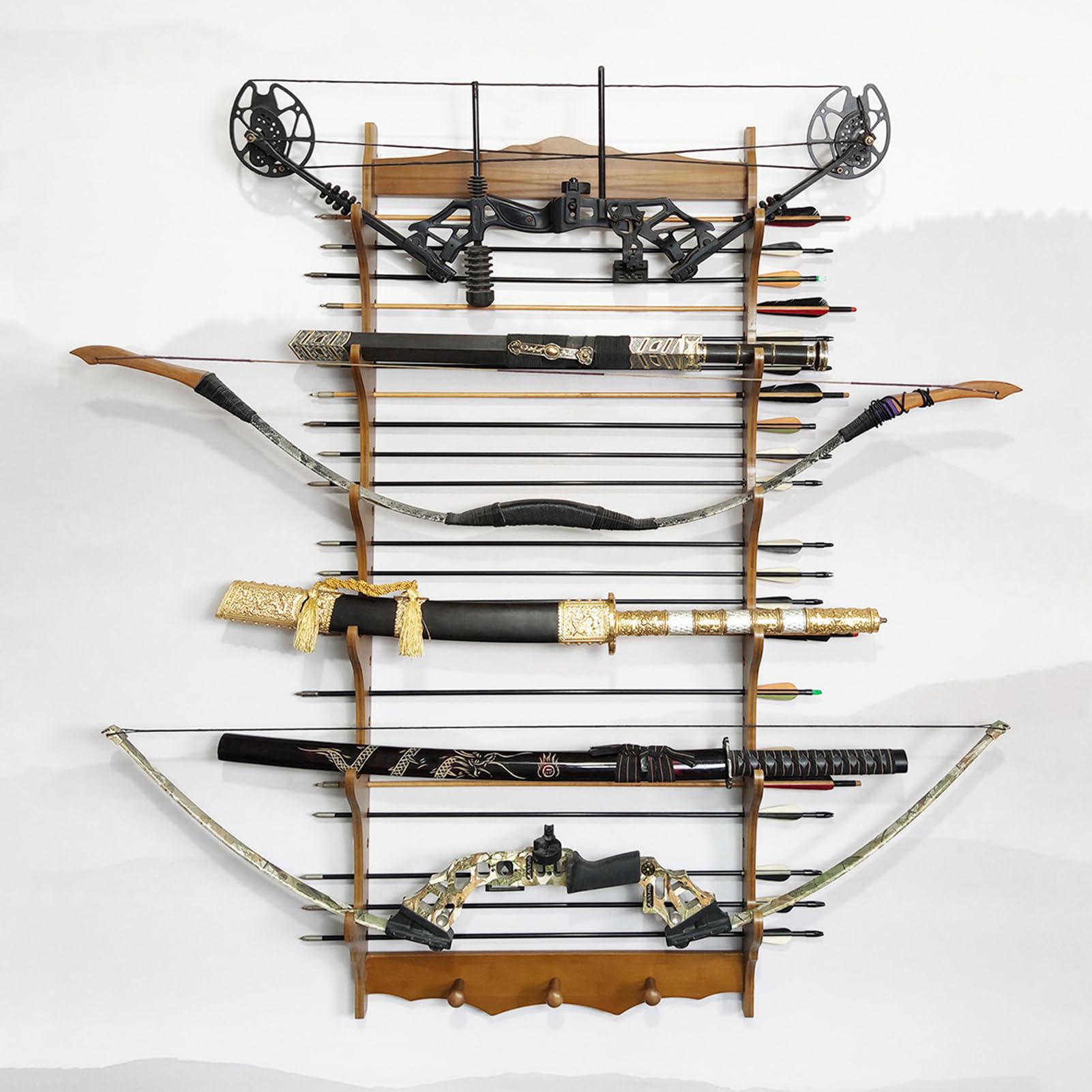 Präsentiere deine Schwerter und Bögen wie ein echter Samurai! Dieser Bambus-Ständer ist nicht nur praktisch, sondern sieht auch mega aus. 59cm lang, höhenverstellbar von 38 bis 133cm - passt in jeden Raum. Hält 1-6 Bögen und 4-25 Pfeile sicher an der Wand. Mit 6cm breiter Kerbe für Bögen und 0.8cm Löchern für Pfeile. Aus stabilem Bambus, 1.5kg schwer - wackelt nicht. Komplett mit allen Befestigungsmaterialien. Ob für deine Sammlung, fürs Training oder als Deko - hier ist alles sicher und ordentlich verstaut. Einfach montieren und deine Waffen kommen perfekt zur Geltung. Für alle Mittelalter-Fans und Bogenschützen!