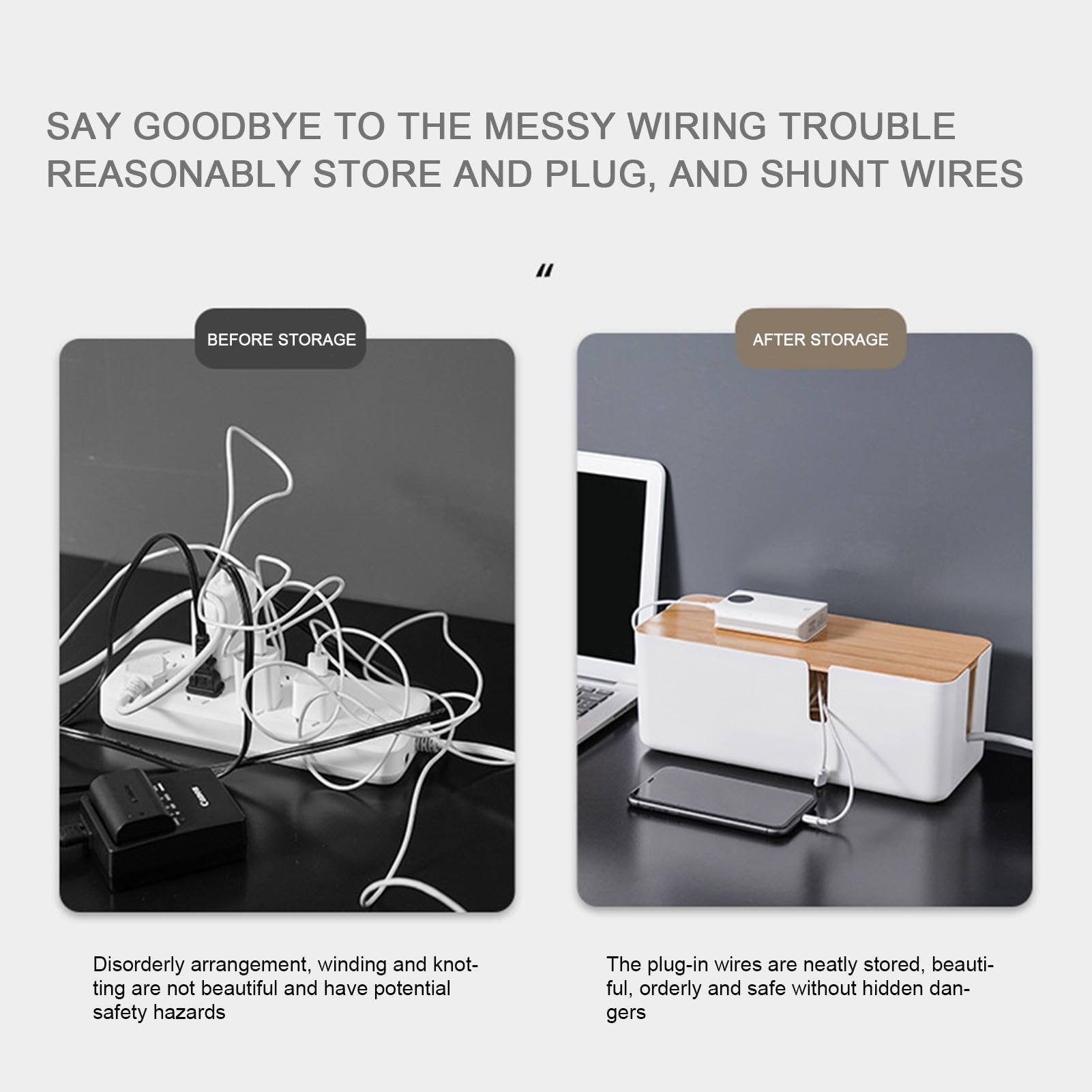 Aus robustem ABS und Bambus gefertigt, hält die Box lange und passt sich dank des schlichten Designs in jedes Zimmer ein. Perfekt für Wohnzimmer, Schlafzimmer oder Home-Office. Endlich kein Kabelsalat mehr - nur noch schöne Ordnung!