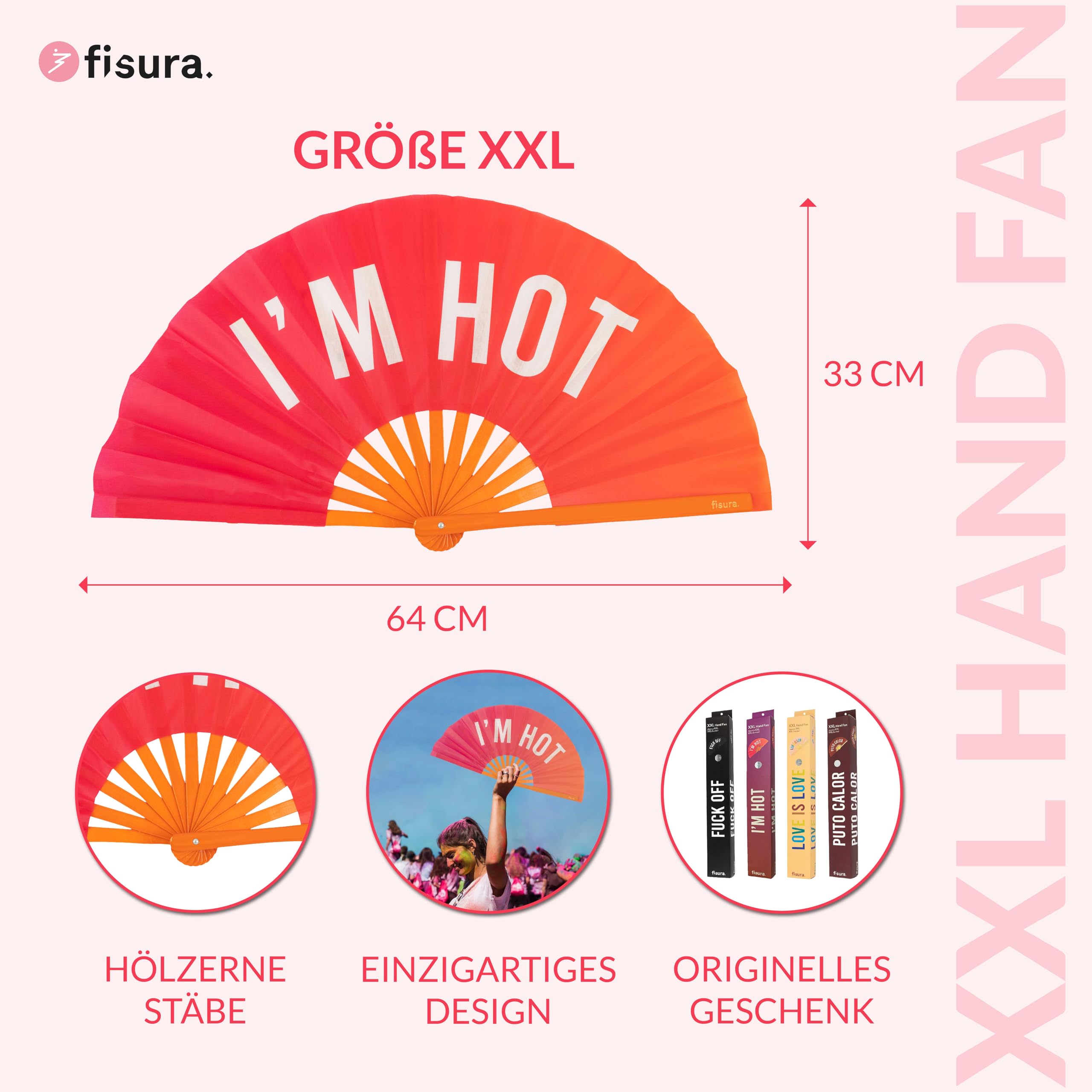 Bei Hitze cool bleiben - mit diesem mega großen Faltfächer von Fisura! Mit stolzen 64cm Länge und 33cm Höhe bringt er richtig viel Luft in Bewegung. Perfekt für Festivals, Raves, Karneval oder entspannte Strandtage. Das Beste: Er ist aus nachhaltigem Bambus und Polyester gefertigt - also umweltfreundlich und langlebig. Die coole 'Love'-Aufschrift macht ihn zum echten Hingucker. Und wenn du ihn nicht benutzt, klappst du ihn einfach zusammen - platzsparend und praktisch. Übrigens: Als Wanddekoration sieht er auch super aus und verleiht deinem Zimmer einen individuellen Touch. Als Geschenk ist er ideal für alle, die es originell mögen oder bei jeder Party dabei sind. Mach die heißen Tage erträglicher und hol dir diesen stylischen Begleiter!