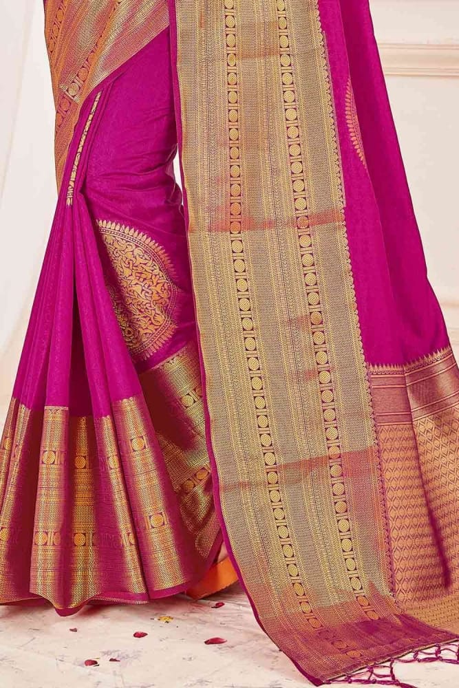 Tauche ein in die Welt der indischen Eleganz mit diesem wunderschönen Banarasi Sari in Rosa und Gold! Mit stolzen 5,5 Metern Länge plus 0,8 Meter Blusenteil und 1,06 Meter Breite bietet dieser Sari dir den perfekten traditionellen Look. Das reich verzierte Pallu ist aufwendig gewebt und verleiht dem gesamten Kleidungsstück eine luxuriöse Ausstrahlung. Perfekt für festliche Anlässe, Hochzeiten oder kulturelle Veranstaltungen - dieser Sari macht jede Frau zur Königin! Die Banarasi Seidensaris gehören zu den edelsten und bekanntesten Saris überhaupt, traditionell aus Benaras stammend und oft mit Goldfäden durchwirkt. Die Qualität spürt man in jedem Detail: Von der weichen Seide bis zur präzisen Webarbeit. Egal ob für junge Frauen oder erfahrene Sari-Trägerinnen - dieser Sari betont die Schönheit jeder Altersgruppe. Ein zeitloses Stück indischer Kultur, das Generationen überdauert und bei jedem Anlass für Bewunderung sorgt. Einfach umlegen, falten und genießen - der Inbegriff indischer Tradition und Eleganz!