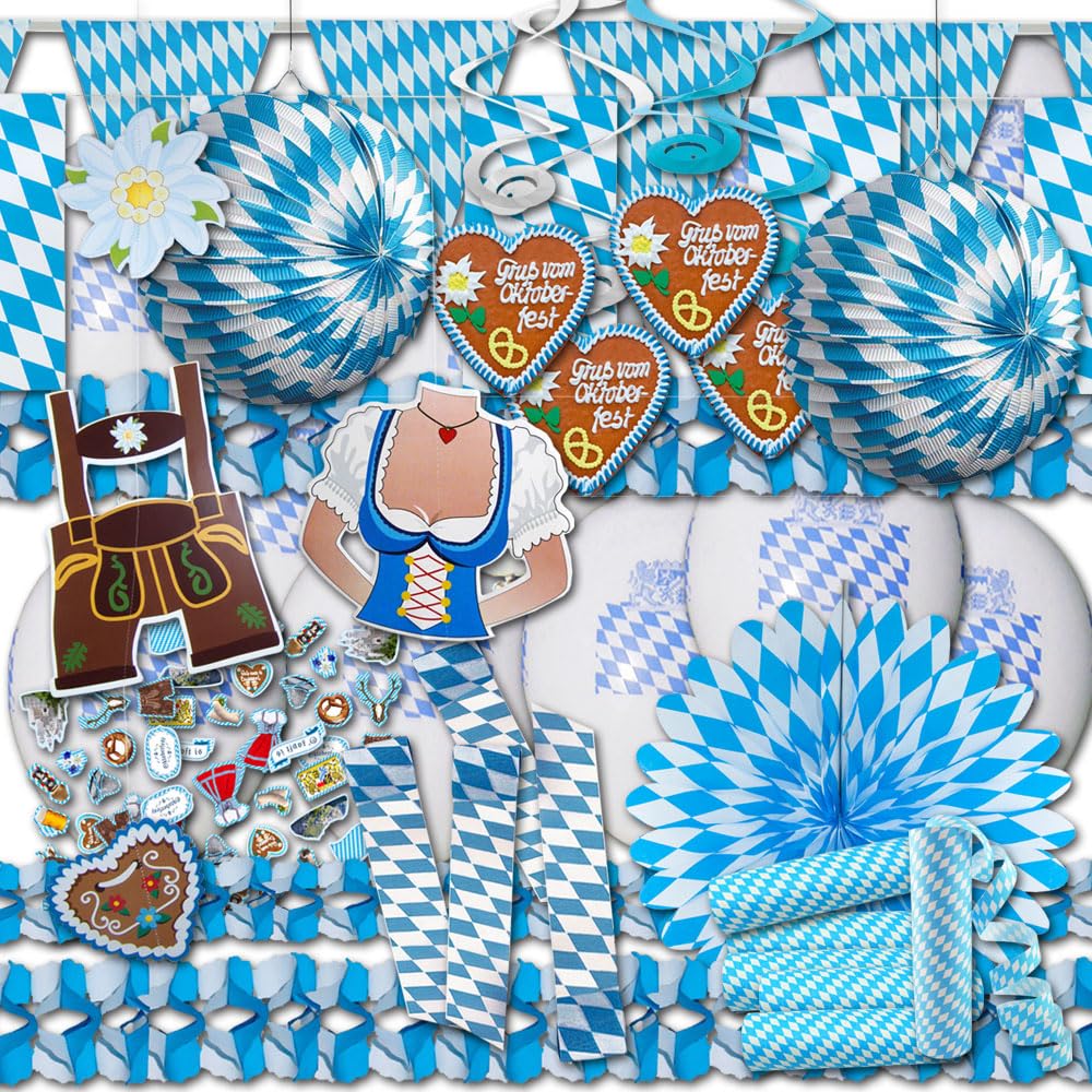 O'zapft is! Mit diesem kompletten Oktoberfest-Set verwandelst du deine Party in ein echtes Wiesn-Vergnügen. Das Riesen-Banner (180x90 cm) ist der absolute Hingucker mit typisch bayerischen Motiven in knalligen Farben. Dazu gibt's 2x4 Meter Flaggen-Kette mit 9 einzelnen Fähnchen - einfach aufhängen mit den praktischen Messing-Ösen, kein Werkzeug nötig! Das Material ist aus hochwertigem PE-Kunststoff, wasserdicht und mega langlebig. Ob in der Wohnung, im Garten oder auf dem Balkon - überall sorgt diese Deko für urige Stimmung. Perfekt für Fotos, denn deine Gäste werden sich nur zu gerne vor dem Banner ablichten lassen! Einfach aufhängen und die Party kann beginnen - Prost! Das Set bringt sofort bayerisches Flair in deine Feier und ist ideal für jeden Oktoberfest-Fan.