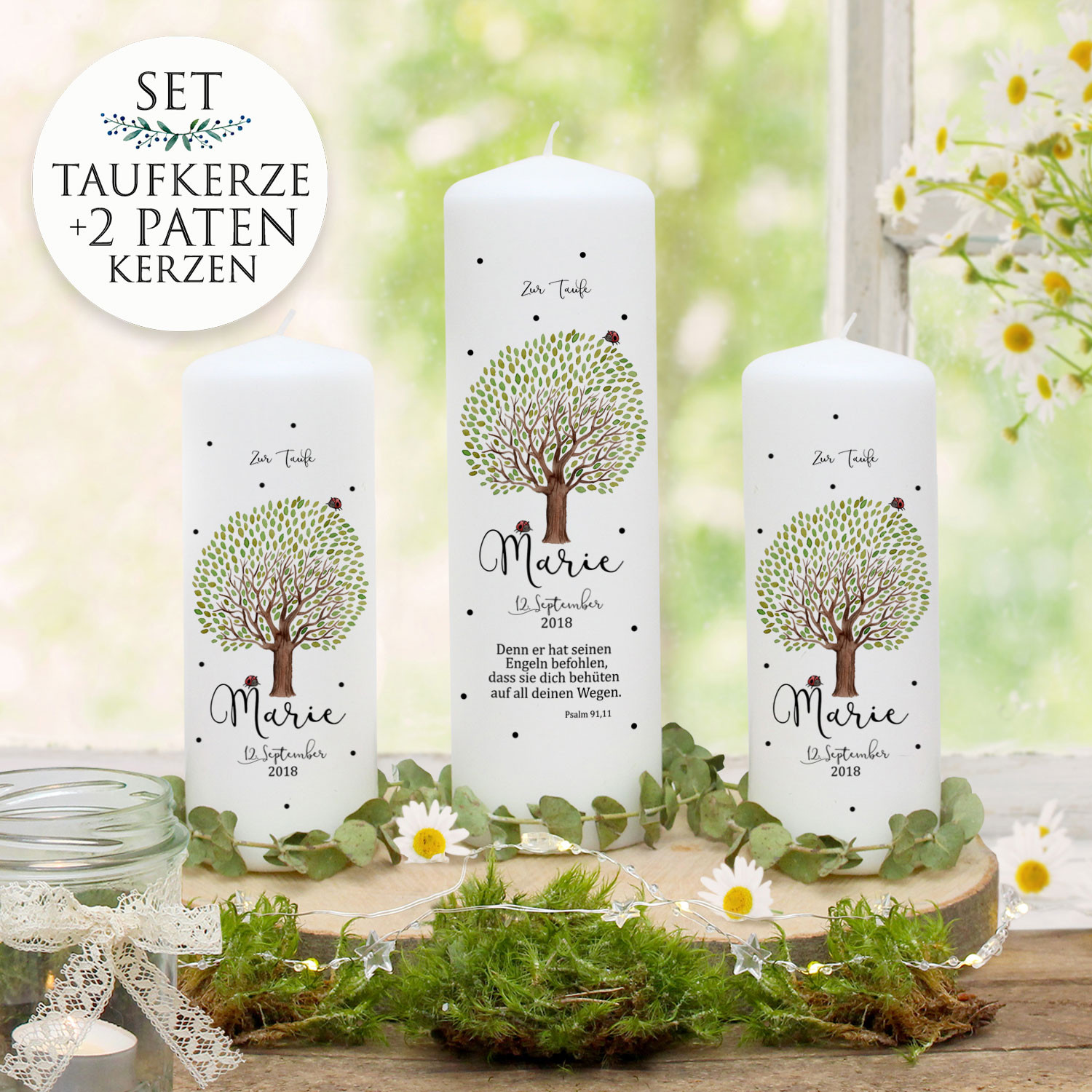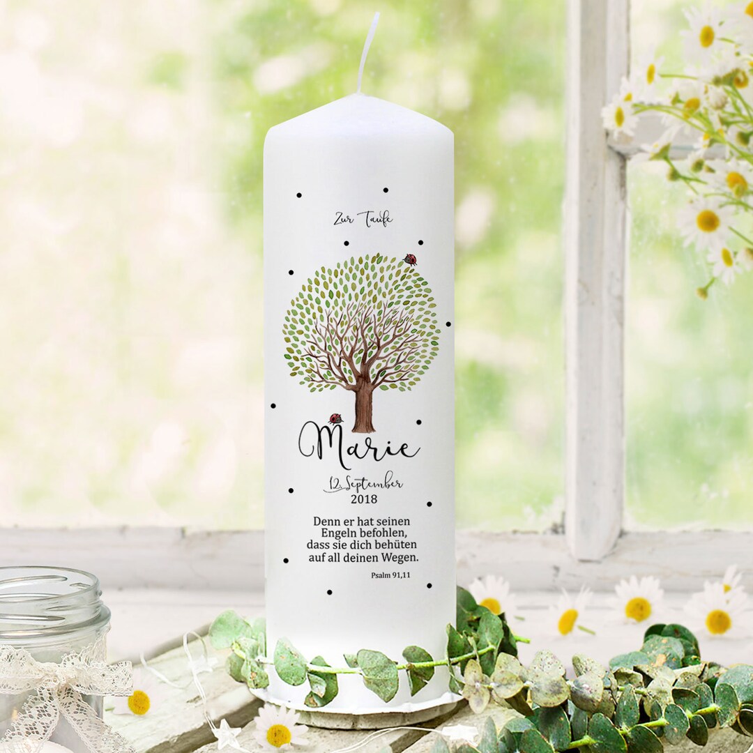 Eine ganz besondere Taufkerze für den großen Tag! Diese wunderschöne Kerze mit Baum und Marienkäfer-Motiv wird in Deutschland handgemalt und personalisiert. Du kannst Namen, Taufdatum und Spruch individuell gestalten. Maße: 25cm hoch, 8cm Durchmesser - die perfekte Größe für die Taufzeremonie. Aus hochwertigen, geprüften Materialien für sicheren Abbrand. Innerhalb von 1-2 Werktagen fertiggestellt und versendet. Es gibt auch passende Patenkerzen und Gastkerzen im Set. Mach die Taufe zu einem unvergesslichen Erlebnis mit dieser einzigartigen, personalisierten Taufkerze!