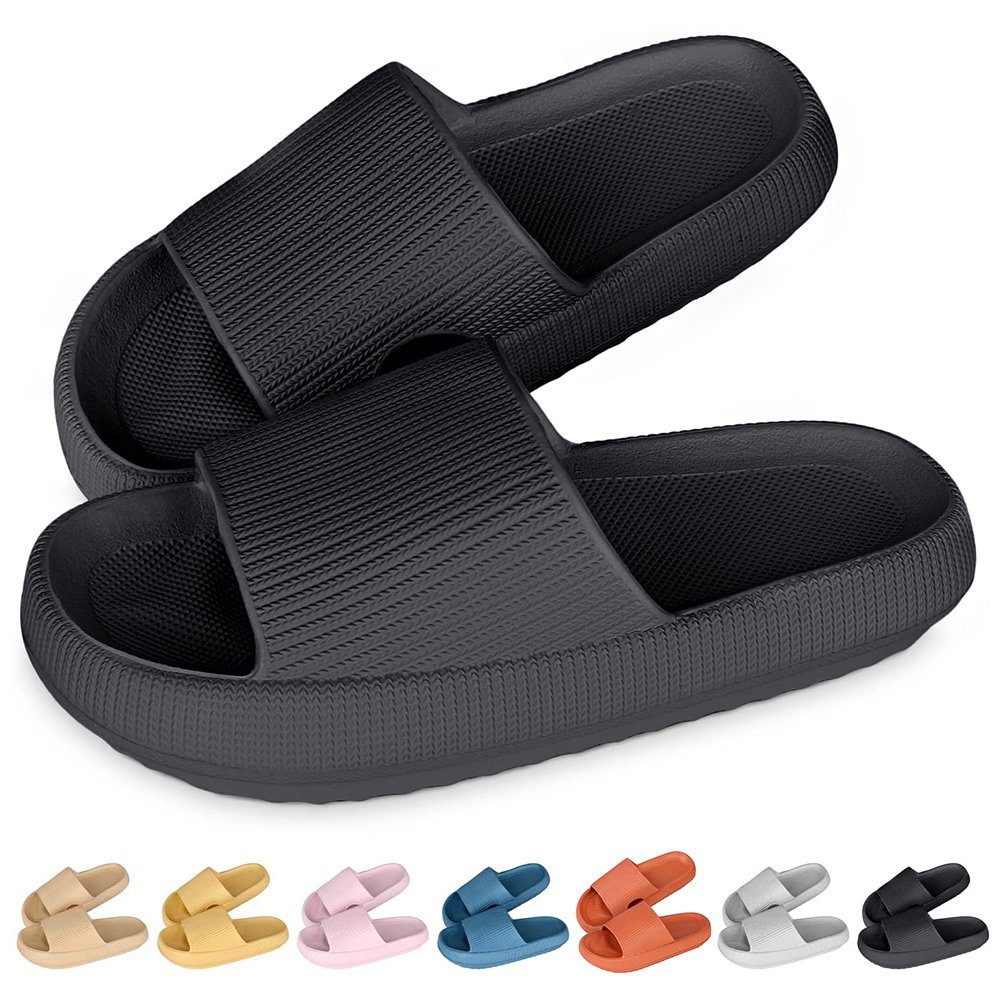 Spürbar himmlischer Komfort! Diese Baumme Hausschuhe sind so weich und bequem, dass du sie am liebsten nie wieder ausziehen möchtest. Mit extradicker, 4 cm starker EVA-Sohle, die jeden Schritt super weich dämpft und deine Füße entlastet. Die rutschfeste, wellenförmige Laufsohle gibt dir auf glatten Böden sicheren Halt - ob im Badezimmer, in der Küche oder in der Sauna. Besonders clever: Die Drainagelöcher lassen Wasser schnell ablaufen und die Schuhe trocknen im Nu - perfekt also auch als Badeschuhe! In vielen trendigen Farben erhältlich: Schwarz, Grau, Rosa, Lila, Khaki, gebrochenes Weiß und Grün. Für Damen und Herren gleichermaßen geeignet. Das ergonomische Design passt sich deiner Fußform an und sorgt für ganztägigen Tragekomfort ohne Druckstellen. Tipp: Für optimalen Komfort lieber eine Nummer größer bestellen! Ob zu Hause, im Hotel oder unterwegs - diese Hausschuhe sind deine tägliche Wohlfühl-Garantie. Gönn deinen Füßen die Erholung, die sie verdienen!