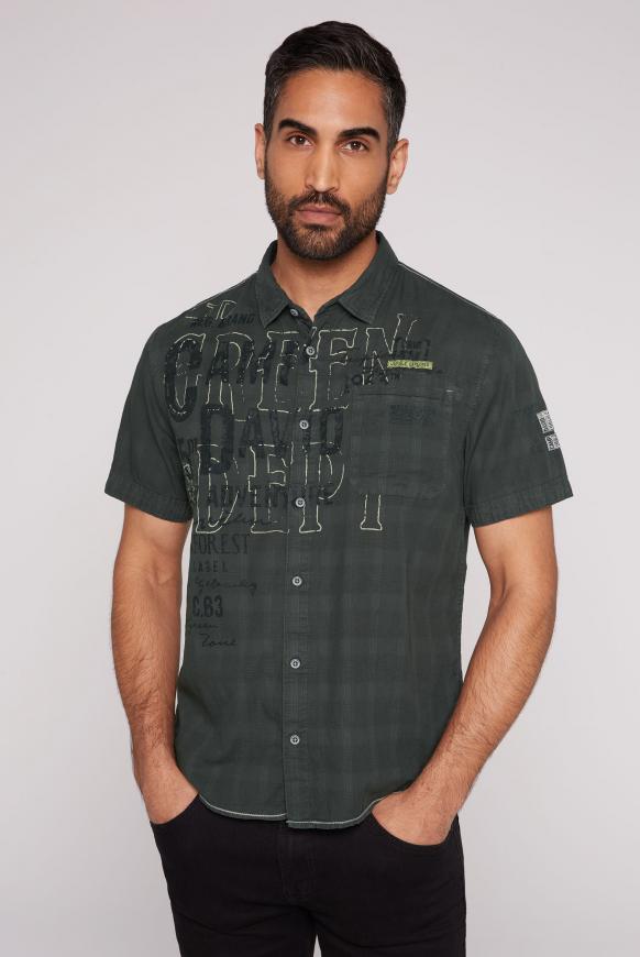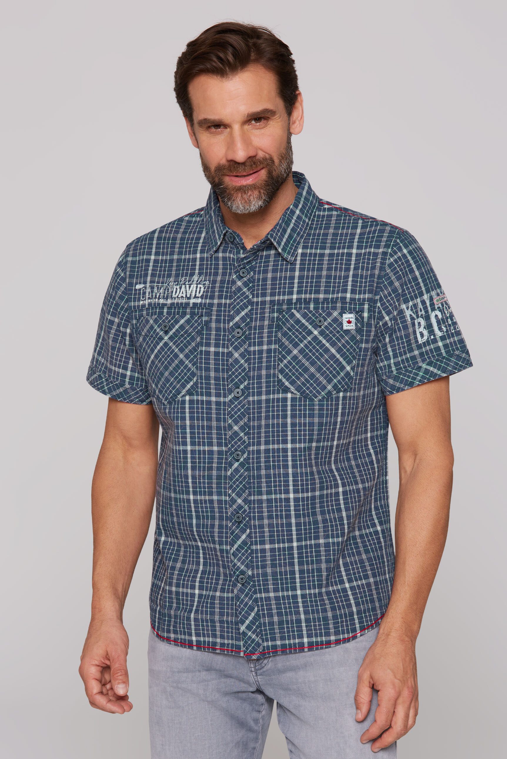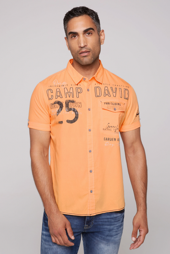 Stylisches Camp David Hemd für den modernen Mann! Aus weicher Baumwoll-Popeline gefertigt, super angenehm zu tragen. Mit trendigen Label Prints auf Vorderseite und Rückenpasse für einen coolen, urbanen Look. Der klassische Kentkragen und die durchgehende Knopfleiste sorgen für perfekte Passform. Die Kurzärmel mit geknöpftem Turn-Up-Saum sind ein stylisches Detail. Perfekt fürs Büro, Business Meetings oder den freizeitlichen Anlass. Ein Allrounder, der sich leicht kombinieren lässt und immer gut aussieht. Hol dir dieses qualitative Hemd für deine Garderobe!