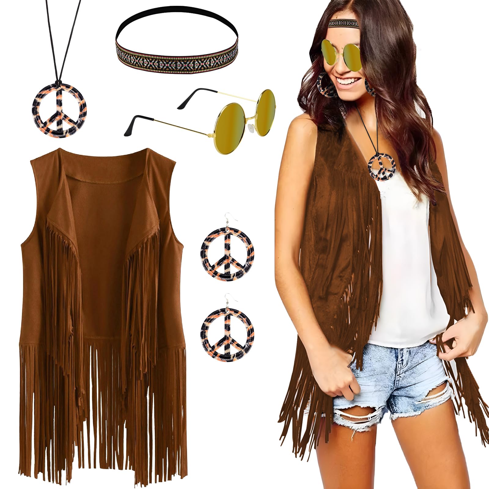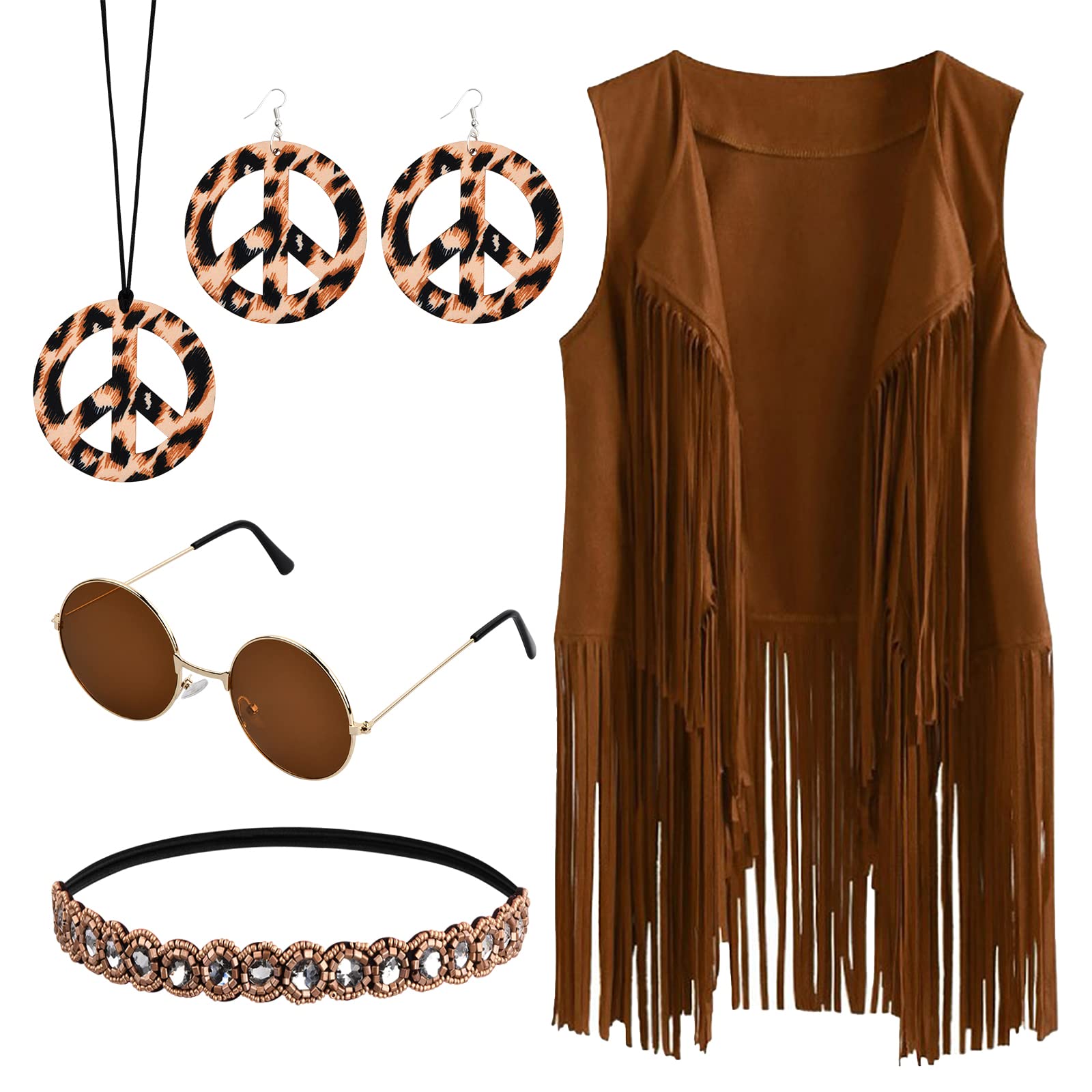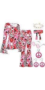 Peace, Love and Flower Power! Dieses komplett Hippie-Kostüm-Set mit 6 Teilen macht dich zum echten 70er-Jahre-Star. Enthalten: Fransenweste, Blumengirlande, Armband, Ohrringe, Halskette und Vintage-Sonnenbrille. Alles in schickem Rosa - einfach anziehen und der Flower-Power-Look ist perfekt! Ideal für Halloween, Karneval, Mottopartys oder 70er-Jahre-Events. Die Weste ist weich und angenehm zu tragen, die Accessoires sehen authentisch aus. Für Männer und Frauen gleichermaßen geeignet. Mach die nächste Party zum unvergesslichen Retro-Event! Einfach mix and match - so wird jede Party zum Woodstock-Festival!