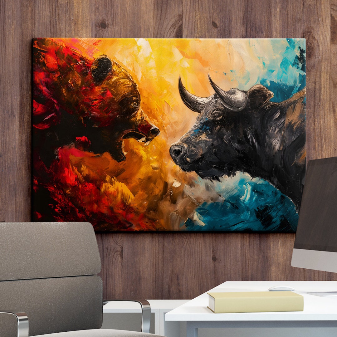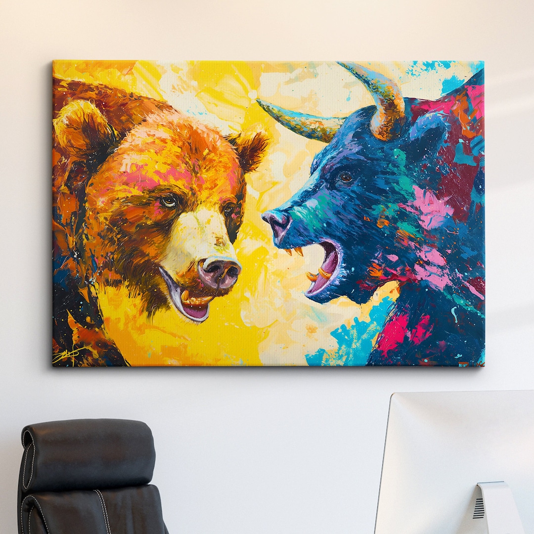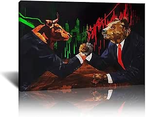 Für alle Börsenfans und Finanzbegeisterte! Dieses coole Bear vs Bull Motiv ist perfekt fürs Home-Office, Büro oder Wohnzimmer. Das Bild zeigt das klassische Börsensymbol in modernem Design - einfach stylisch! Mit den Maßen 30,5x40,6 cm ist es ideal für verschiedene Räume. Die Leinwand ist hochwertig bedruckt, auf einen soliden Holzrahmen gespannt und bereits fertig gerahmt geliefert. Ein großer Vorteil: Die Oberfläche ist wasserfest - du kannst Staub einfach mit einem feuchten Tuch abwischen. Das Aufhängen ist super einfach: Haken und Zubehör sind bereits im Lieferumfang enthalten. Perfekt für alle, die ihrem Zuhause oder Büro eine persönliche Note verleihen wollen. Ob im Konferenzraum, Flur oder Wohnzimmer - dieses Motiv kommt immer gut an. Auch ein tolles Geschenk für Kollegen, Freunde oder Familienmitglieder, die sich für Finanzen interessieren. Geburtstage, Weihnachten oder einfach mal so - dieses Bild ist immer passend. Bringt Farbe und Stil in deine vier Wände und zeigt deine Leidenschaft für die Börse!