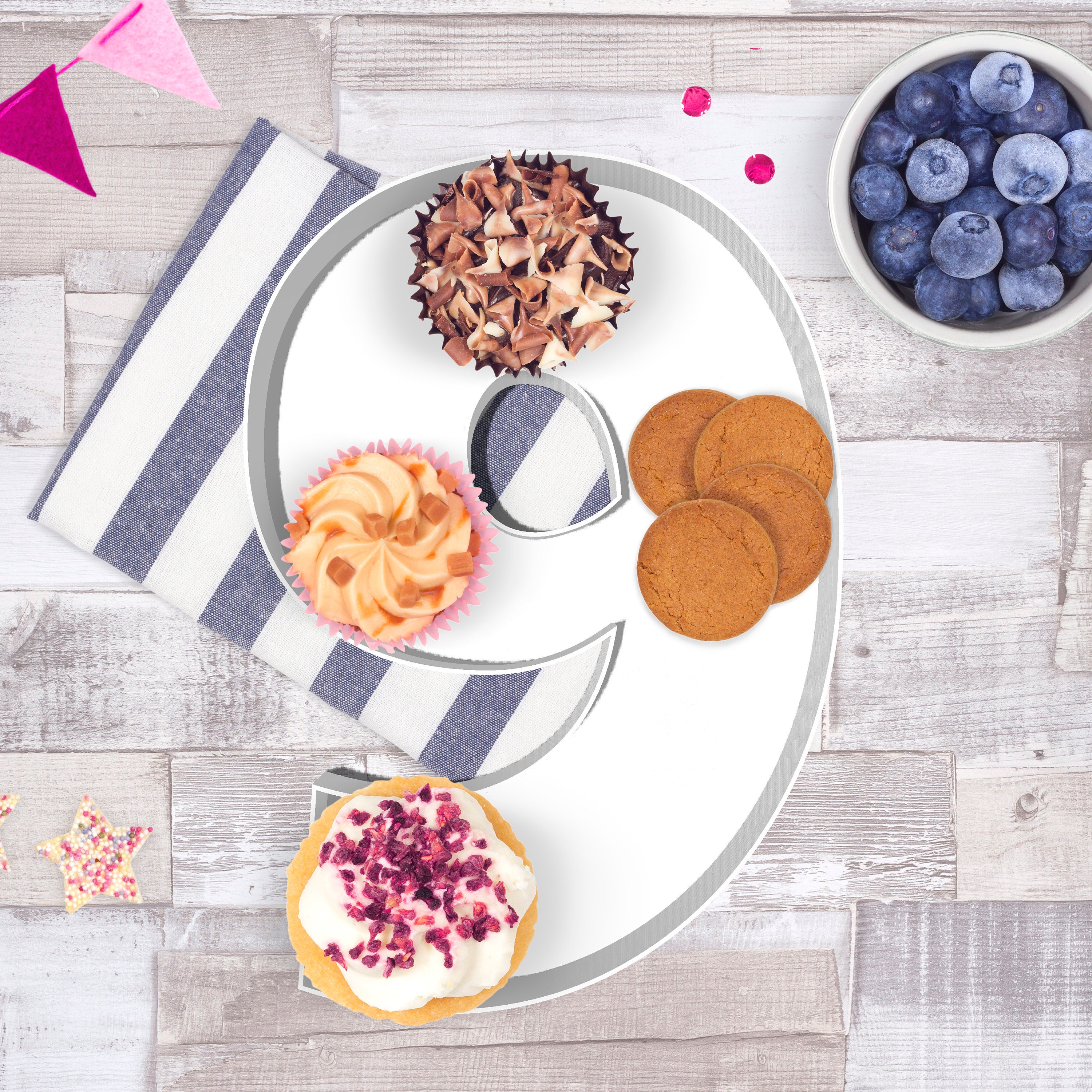 Planst du eine Geburtstagsfeier und suchst nach einer besonderen Deko? Dieses Pappnummer-Tablett ist genau das Richtige! Mit stolzen 35,6cm Größe ist es ein echter Hingucker auf jedem Buffet-Tisch. Einfach mit Leckereien befüllen - ob Käse, Crackern, Cupcakes oder Früchten. Die stabile Pappkonstruktion hält alles sicher und sieht dabei noch richtig edel aus. Perfekt für Geburtstage, Jubiläen oder andere Feiern. Du kannst die Zahl sogar noch weiter verzieren - mit Bändern, Blumen oder was dir sonst noch einfällt. Und das Beste: Keine Montage nötig, einfach auspacken und dekorieren! Also, mach deine nächste Party unvergesslich mit diesem tollen Zahlen-Tablett.