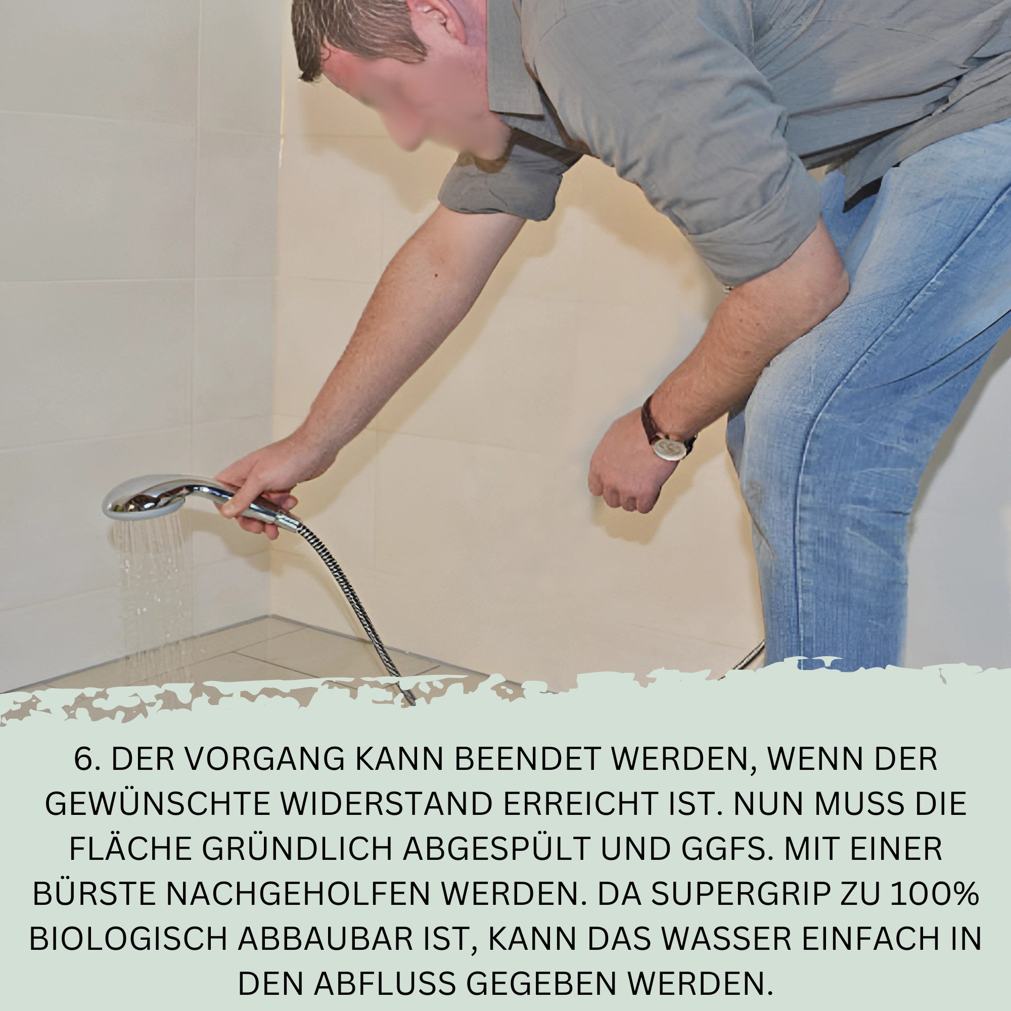 Achtung, Rutschgefahr! Dieses SUPERGRIP Antirutsch-Mittel von MediMuc ist der absolute Game-Changer für alle rutschigen Oberflächen in deinem Zuhause. Egal ob glasierte Fliesen im Bad, polierter Granit im Hauseingang oder die glatte Duschwanne - mit dieser Behandlung wird alles bis zu 300% rutschfester! Das Beste: Eine Flasche reicht für ganze 1,5 Quadratmeter - also perfekt für Duschkabine, Terrasse oder Hauseingang. Im Lieferumfang ist alles dabei, was du brauchst: Die Antirutsch-Behandlung, Schwamm, Einmalhandschuhe und eine verständliche Anleitung. Einfach auftragen, einwirken lassen und schon kannst du sicher durch dein Bad laufen. Super für Haushalte mit Kindern, älteren Menschen oder einfach für alle, die Stürze vermeiden wollen. Funktioniert auf keramischen Fliesen, Steinzeug, Granit, Gneis, Quarzit und Emaille-Oberflächen. Mach dein Zuhause sicherer - ohne teure Umbauten oder rutschige Teppiche! Einfach genial und so effektiv - warum hast du das nicht schon längst ausprobiert?