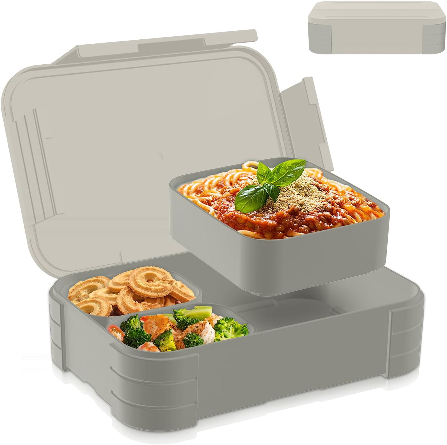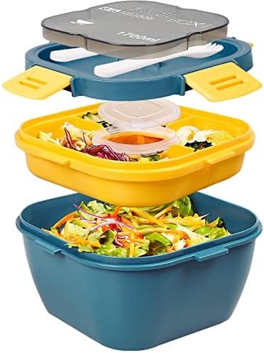 Perfekt für alle, die ihr Essen mit zur Arbeit, Schule oder zum Picknick nehmen wollen! Diese beiden Bento-Boxen haben 4 praktische Fächer - eins großes und drei kleine. So kannst du Salat, Obst, Snacks und Hauptgericht schön getrennt transportieren. Das geniale Design: 4 Verschlussclips und ein dichter Silikonring sorgen dafür, dass wirklich nichts ausläuft. Noch praktischer: Im Deckel sind gleich ein Saucenbecher (48ml) UND Besteck (Löffel, Gabel, Messer) integriert! Muss man nicht extra dran denken. Aus BPA-freiem, lebensmittelechtem Material und sowohl mikrowellen- als auch spülmaschinenfest (Deckel vorher abmachen!). Mit 1300ml Fassungsvermögen und den Maßen 22,9x16,5x8,6cm ist genug Platz für eine komplette Mahlzeit. Wichtig: Nicht für Kinder unter 6 Jahren geeignet wegen Kleinteilen.